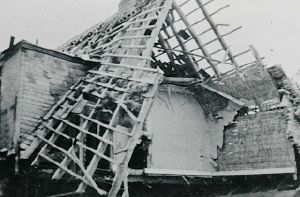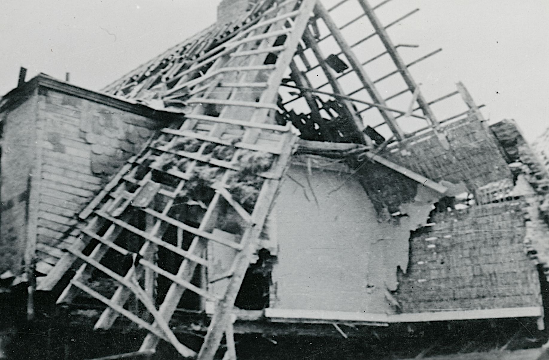 Maskingenkendt tekst fra fotokuvert: Odense, Platanvej. Fejlbombning på grund glimt fra sporvogn.