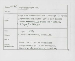 Maskingenkendt tekst fra fotokuvert: engelske bombemaskiner forfulgt af tyske jagermaskiner måtte lette for bomber. Vestmøn
