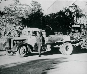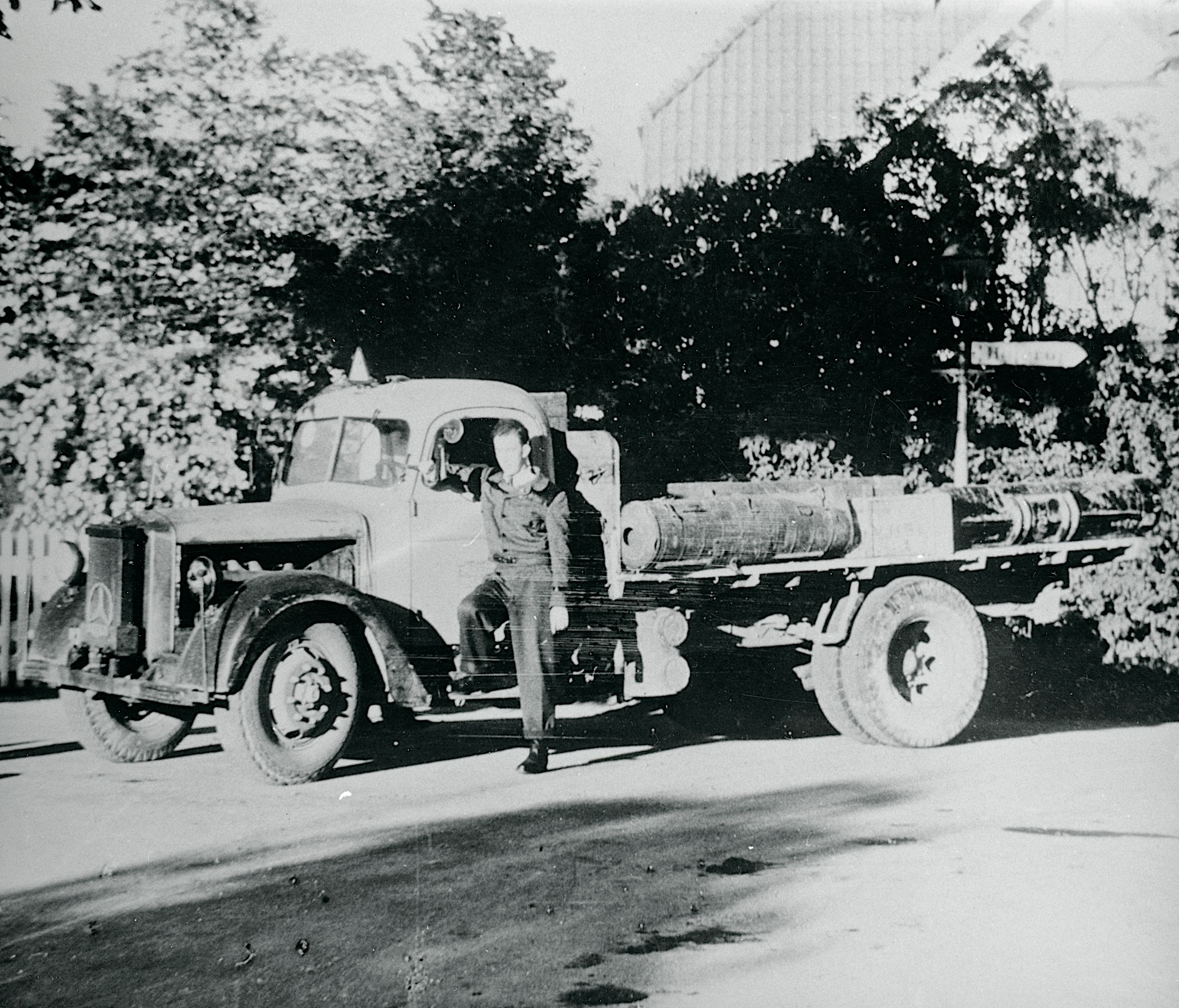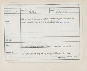 Maskingenkendt tekst fra fotokuvert: Bilen med fiskeexportør Brammer, der bragte de ti amerikanere til Faxe Ladeplads
