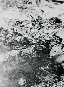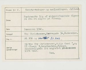 Maskingenkendt tekst fra fotokuvert: Forbrændte lig af uidentificerede flyvere fra et angreb på Ålborg.