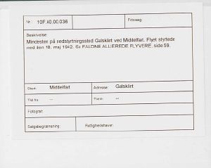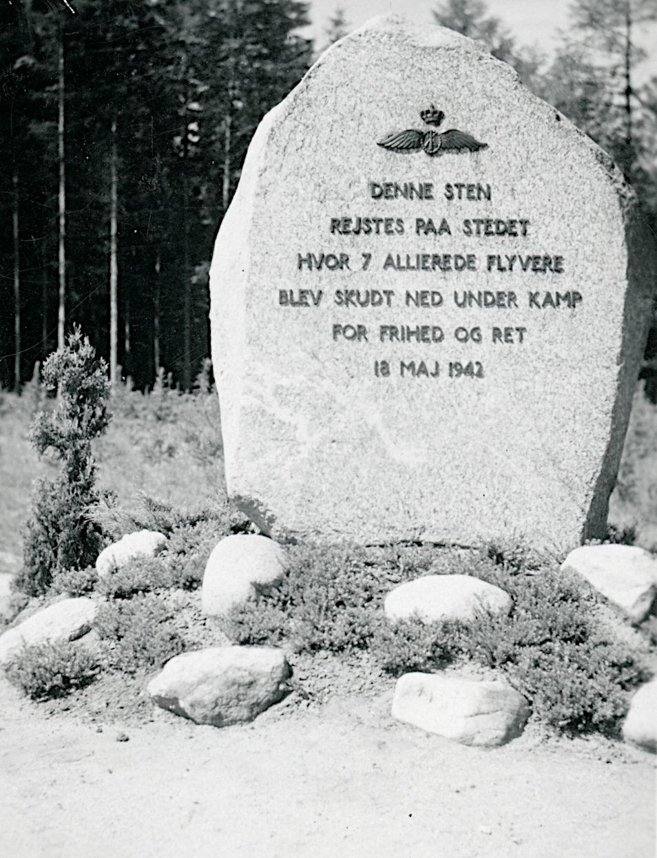 Maskingenkendt tekst fra fotokuvert: Mindesten på nedstyrtningssted Galsklint ved Middelfart. Flyet styrtede ned den 18. maj 1942.