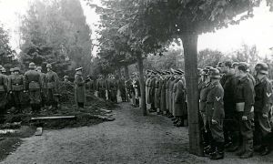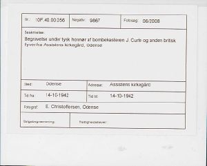 Maskingenkendt tekst fra fotokuvert: Begravelse under tysk honnør af bombekasteren J. Curie og anden britisk flyver fra Asslstens kirkegård, Odense
