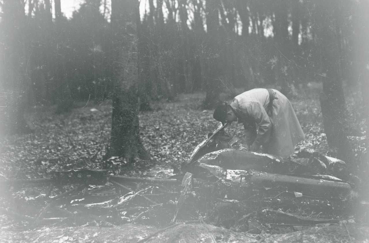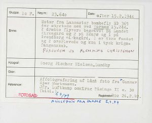 Maskingenkendt tekst fra fotokuvert: Motor fra Lancaster bombefly ND 365 der styrtede ned ved Vornæs 15.244.