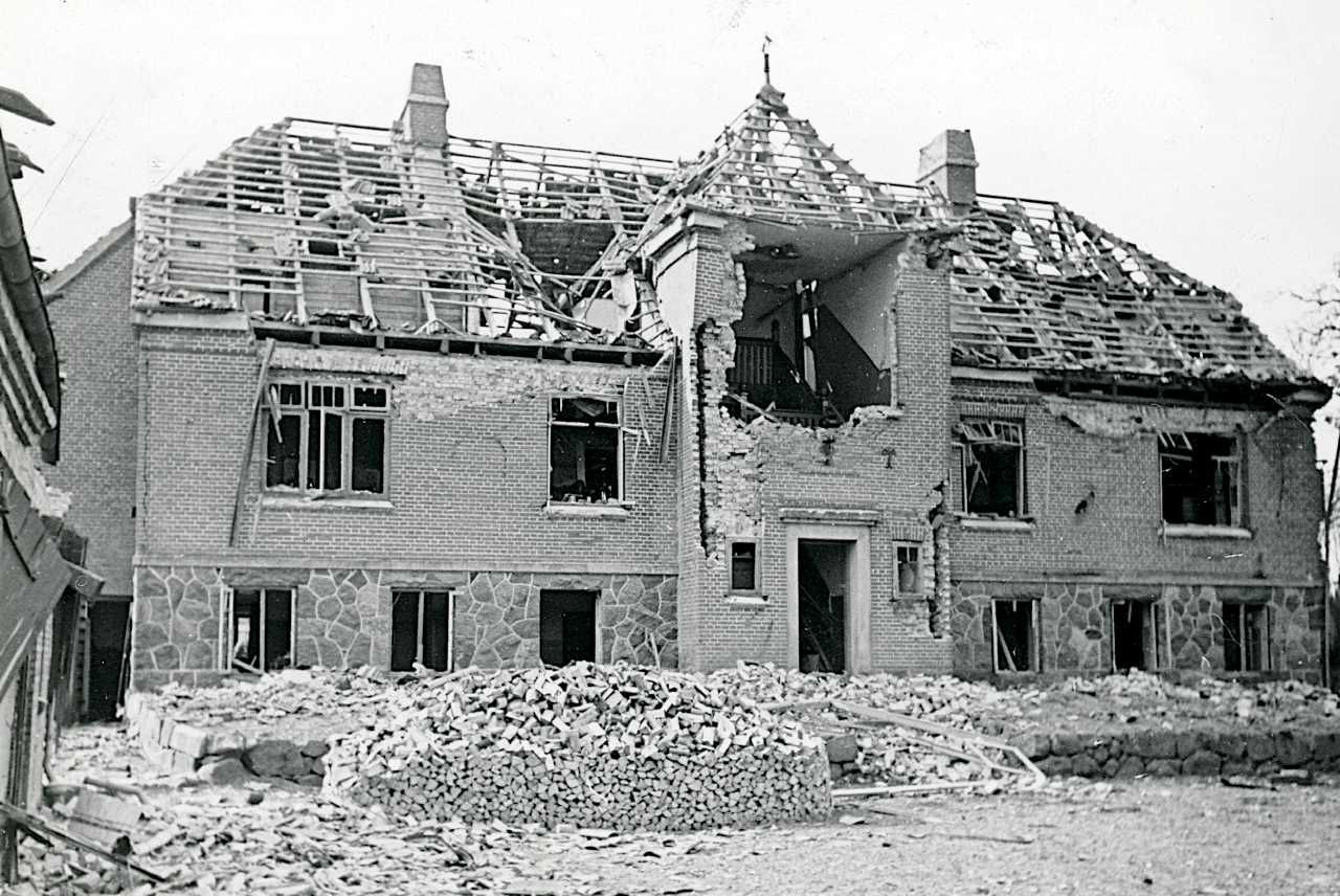 Maskingenkendt tekst fra fotokuvert: Gammeltofte by Fyen. Ødelagte ejendomme, efter nedstyrtninger.