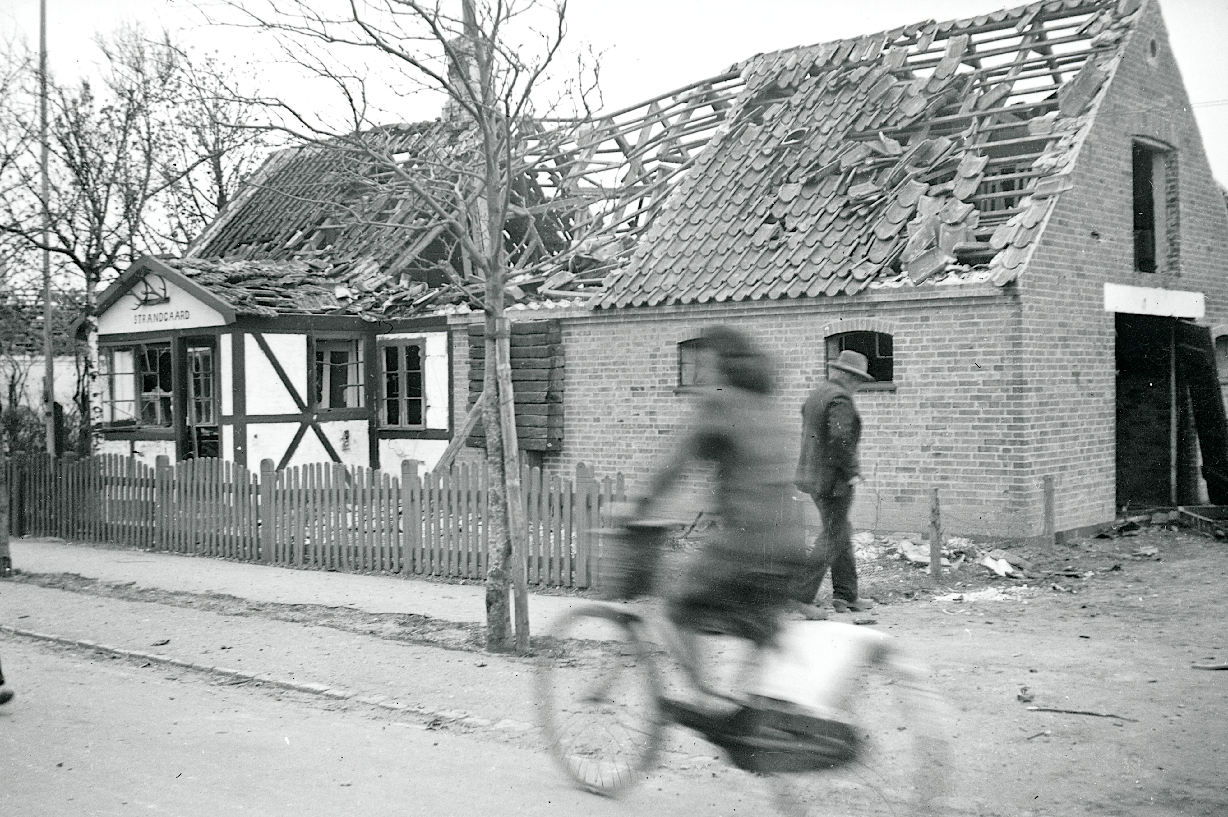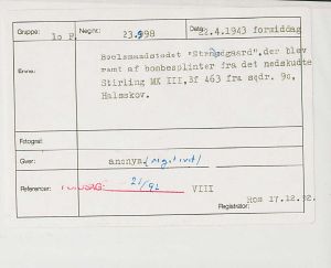Maskingenkendt tekst fra fotokuvert: Boelsmandstedet "Strandgaard", der blev ramt af bombesplinter fra det nedskudte Stirling MK III, Bf 463 fra sqdr. 90 Halsskov.