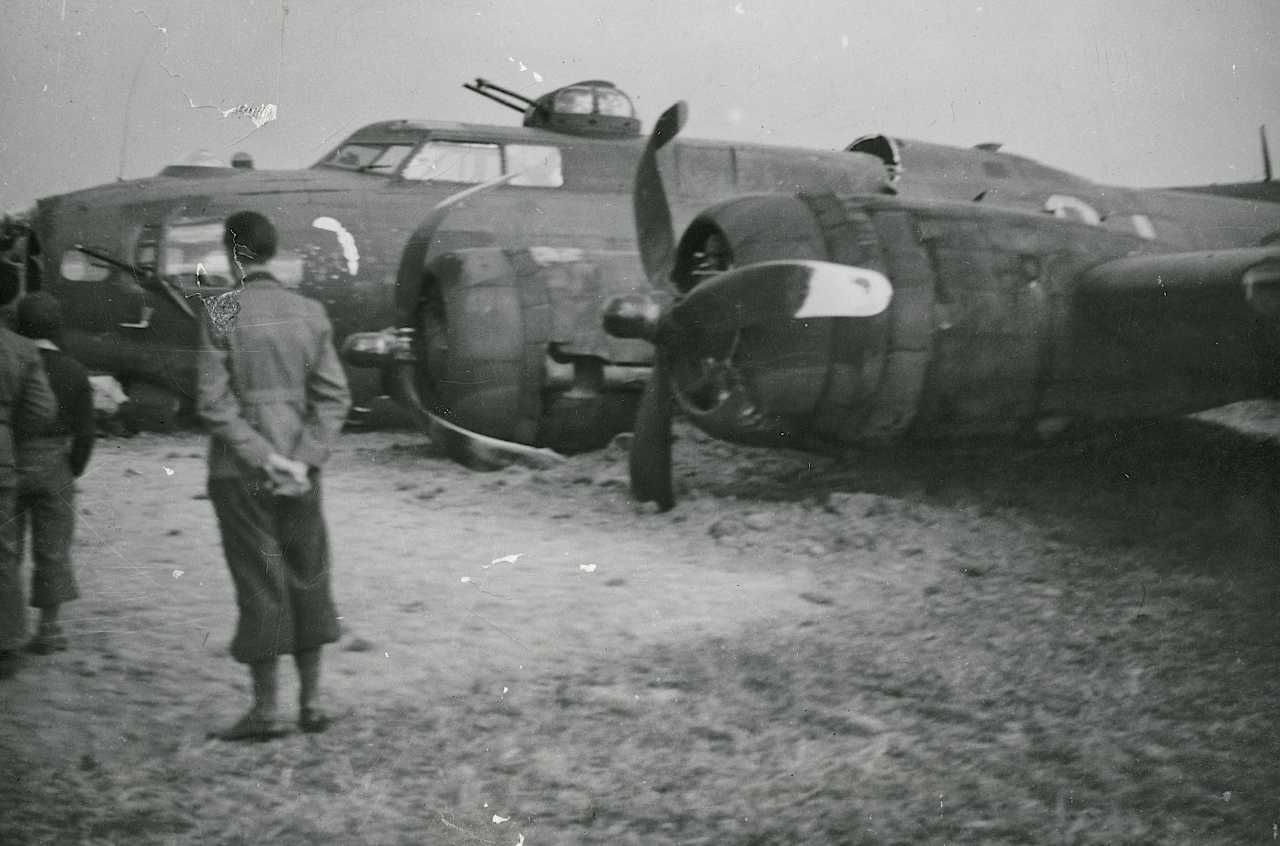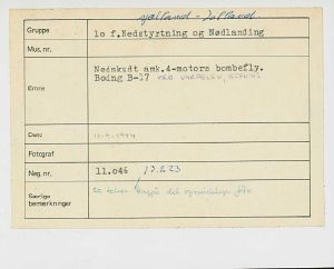 Maskingenkendt tekst fra fotokuvert: Nedskudt amk.4-motors bombefly. Boing B-17
