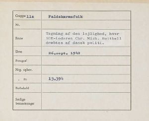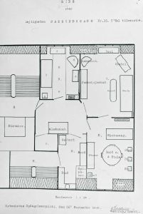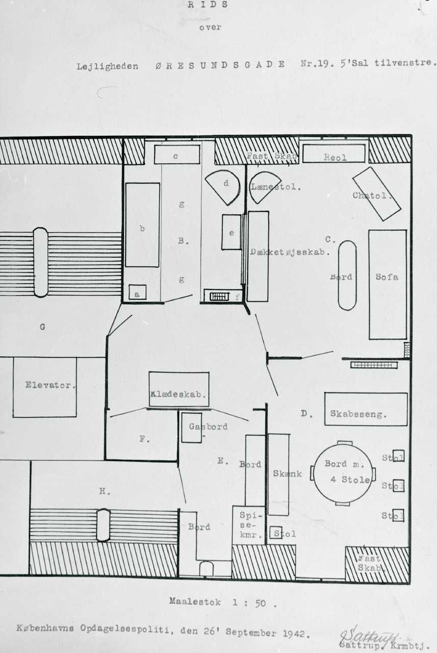 Tegning af den lejlighed i Øresundsgade, hvor SOE-lederen Chr. Michael Rottbøll blev dræbt af dansk politi den 26. september 1942.