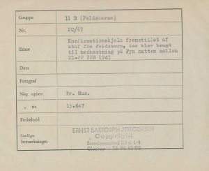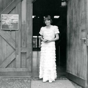 Konfirmationskjole syet af stof fra faldskærm nedkastet på Fyn d. 21. februar 1945. Her fotograferet foran Frihedsmuseet i København