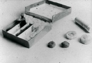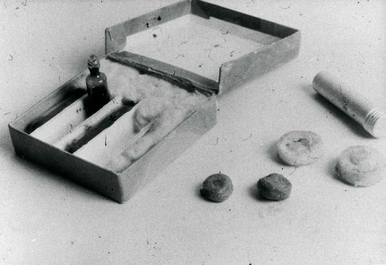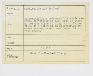 Maskingenkendt tekst fra fotokuvert: Betydningsfulde modstandsfolk havde sådanne giftpiller på sig. Blev de taget af Gestapo, kunne de sluge en pille, og ville dø i løbet af få sekunder, så de under tortur, ikke kunne komme til at røbe noget.