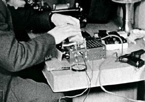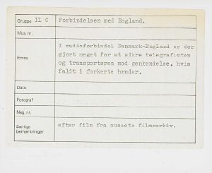 Maskingenkendt tekst fra fotokuvert: I radioforbindelse Danmark-England er der gjort meget for at sikre telegrafisten og transportøren mod genkendelse, hvis faldt i forkerte hænder.