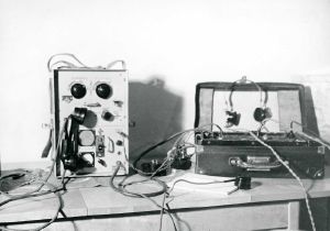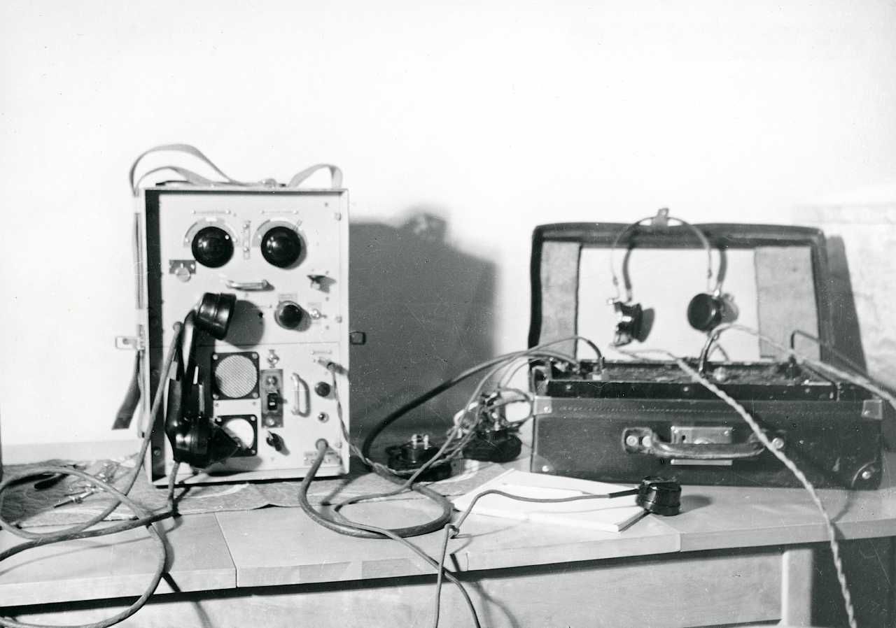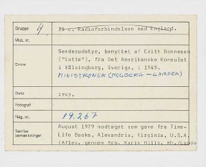 Maskingenkendt tekst fra fotokuvert: Senderudstyr, benyttet af Edith Bonneseri ("Lotte"), fra Det Amerikanske Konsulat i Hælsingborg, Sverige, i 1945.