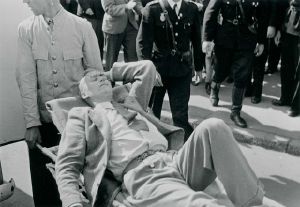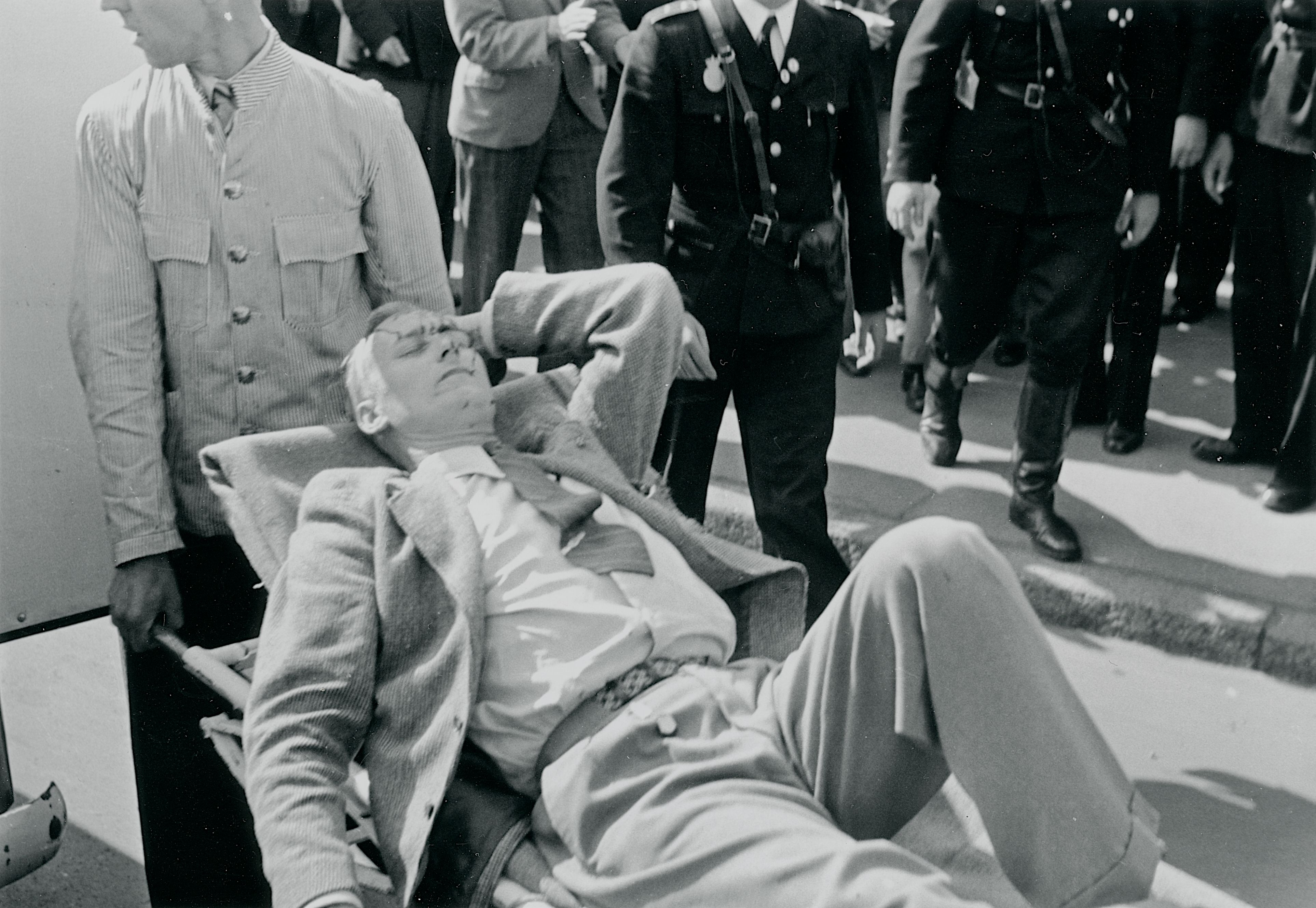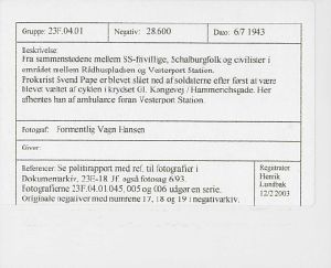 Maskingenkendt tekst fra fotokuvert: Fra sammenstødene mellem SS-frivillige, Schalburgfolk og civilister i området mellem Rådhuspladsen og Vesterport Station. Prokurist Svend Pape er blevet slået ned af soldaterne efter først at være blevet væltet af cyklen i krydset GI. Kongevej / Hammerichsgade. Her afhentes han af ambulance foran Vesterport Station.
