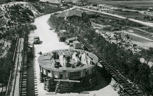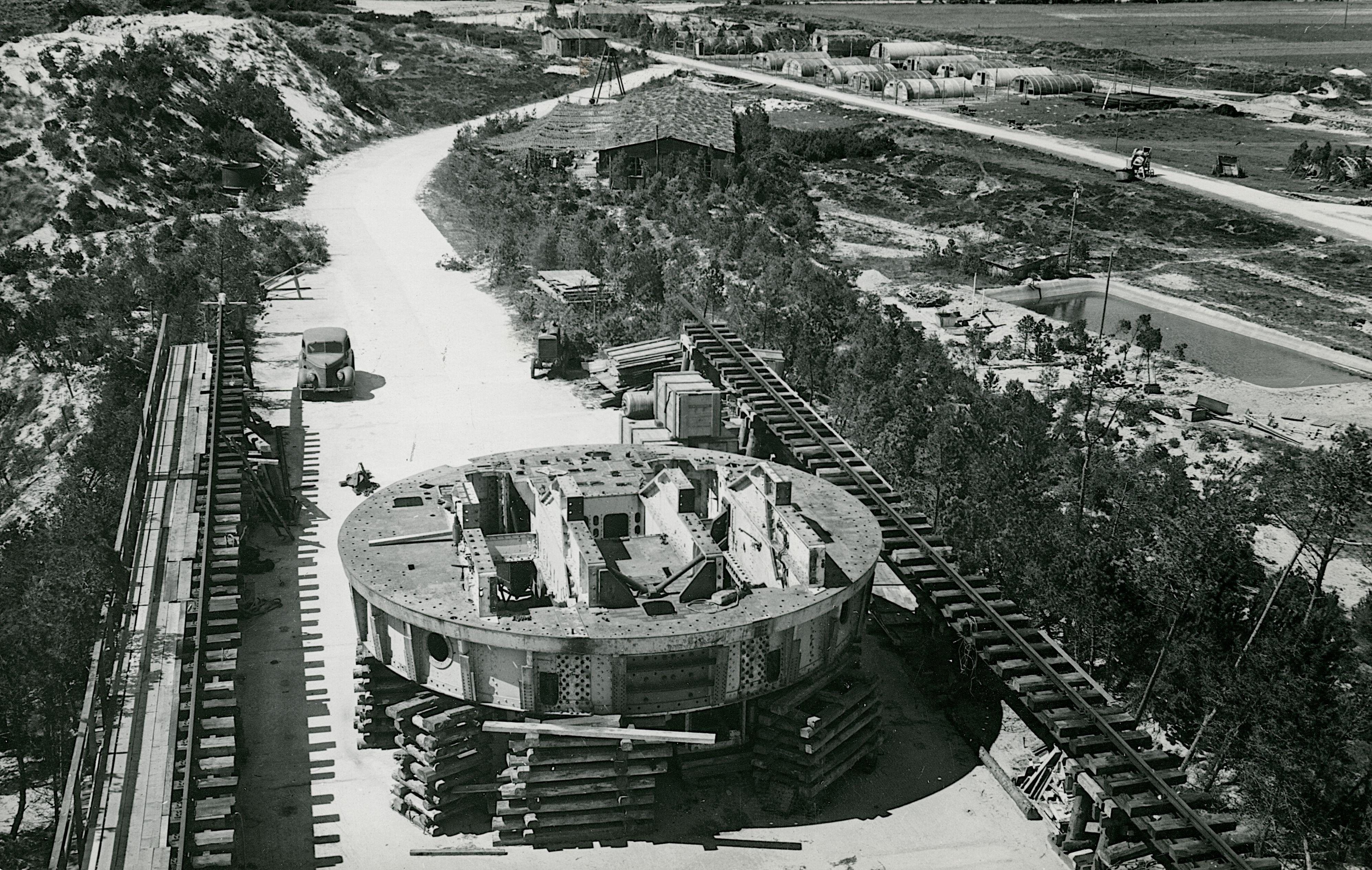 Kanonlavet for 38 cm kanon på læsserampe ved Tirpitz-stillingen ved Oksby. Stillingen nåede ikke at blive funktionsdygtig inden befrielsen