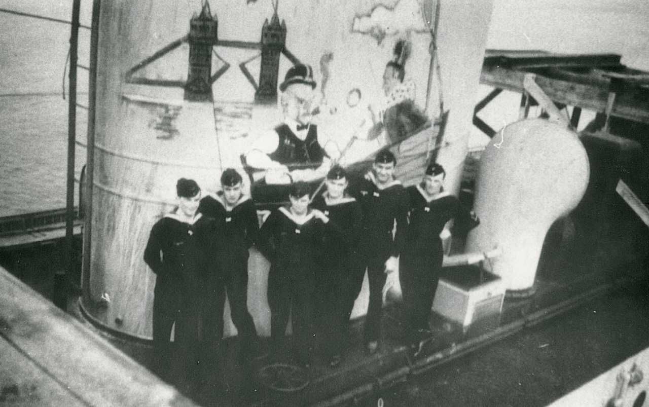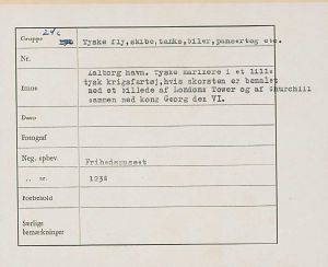 Maskingenkendt tekst fra fotokuvert: Aalborg havn. Tyske marinere i et lille tysk krigsfartøj, hvis skorsten er bemale med et billede af Londons Tower og af Churchill sammen med kong Georg den VI.