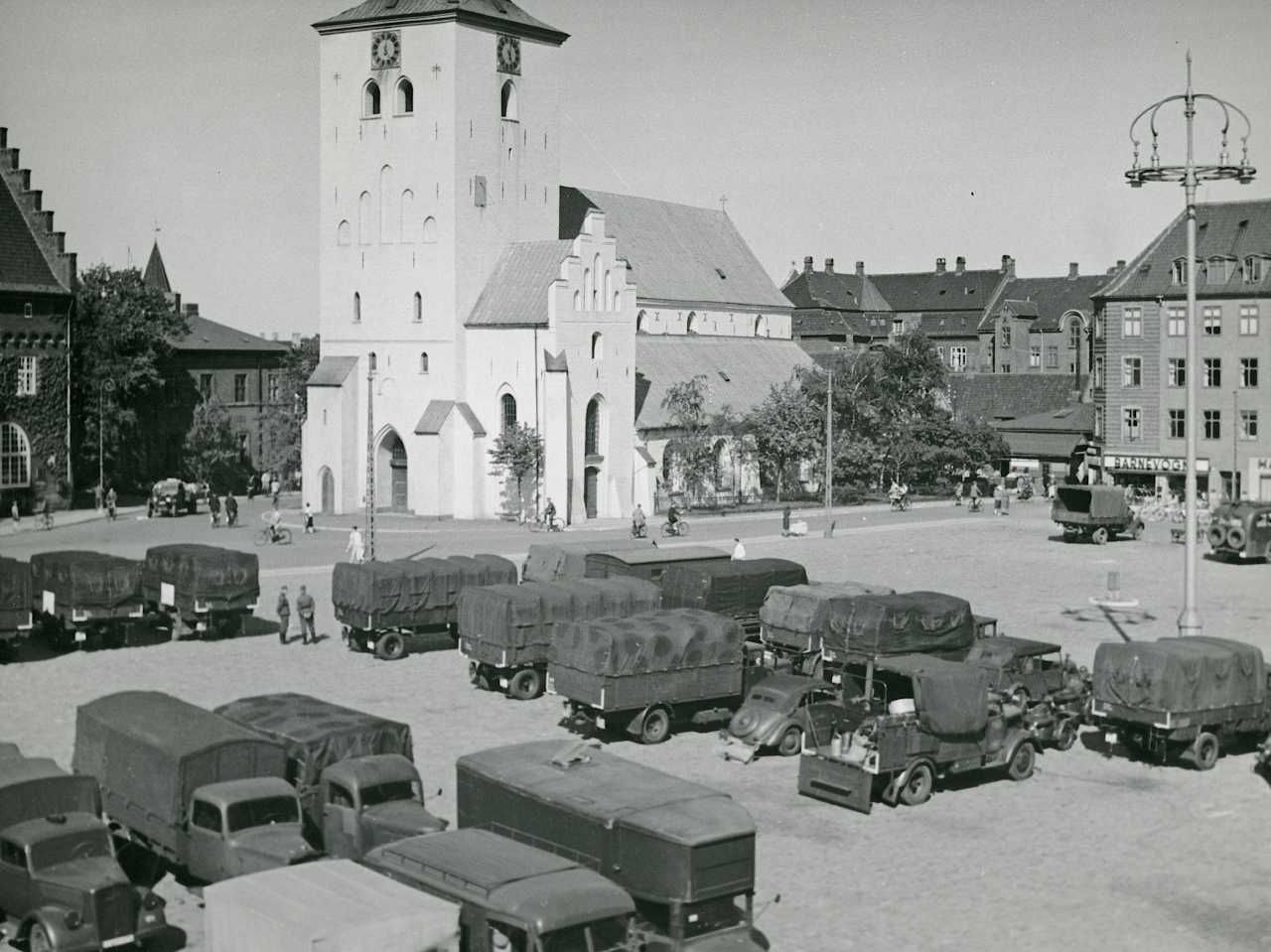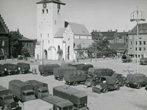 Tyske køretøjer foran Budolfi Kirke i Ålborg
