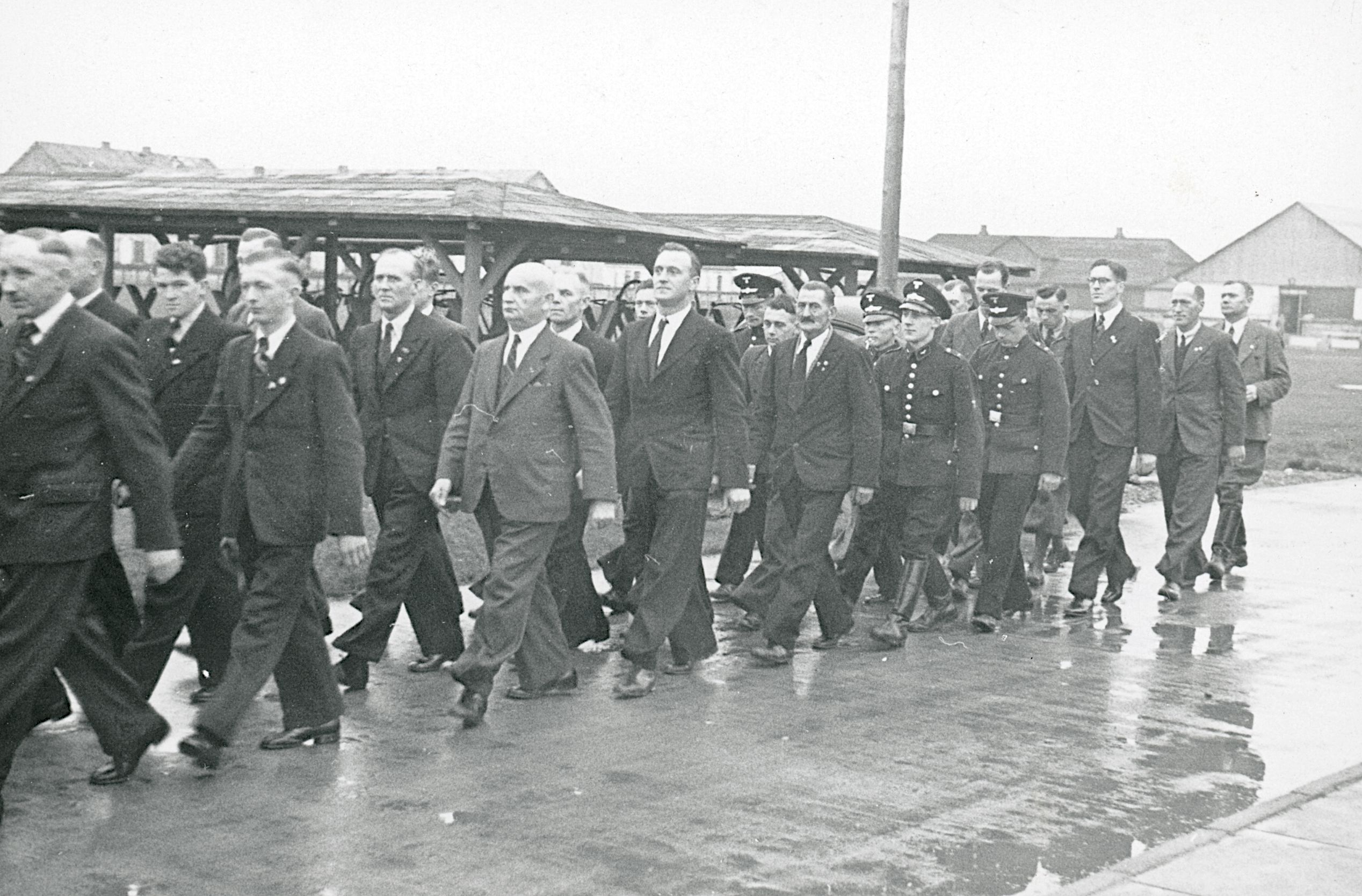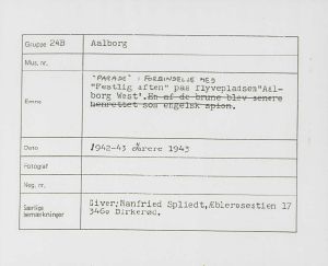 Maskingenkendt tekst fra fotokuvert: Festlig aften på flyvepladsen "Aalborg West". En af de brune blev senere henrettet som engelsk spion.
