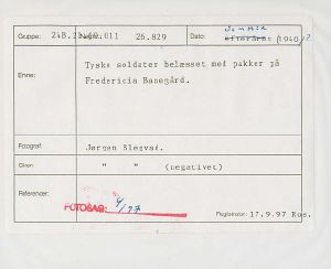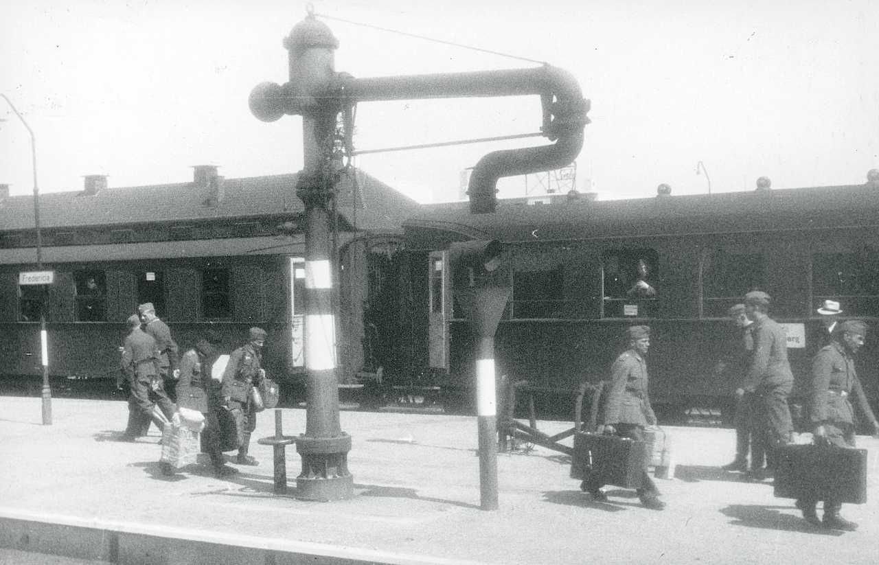 Maskingenkendt tekst fra fotokuvert: Tyske soldater belæsset med pakker på Fredericia Banegård.
