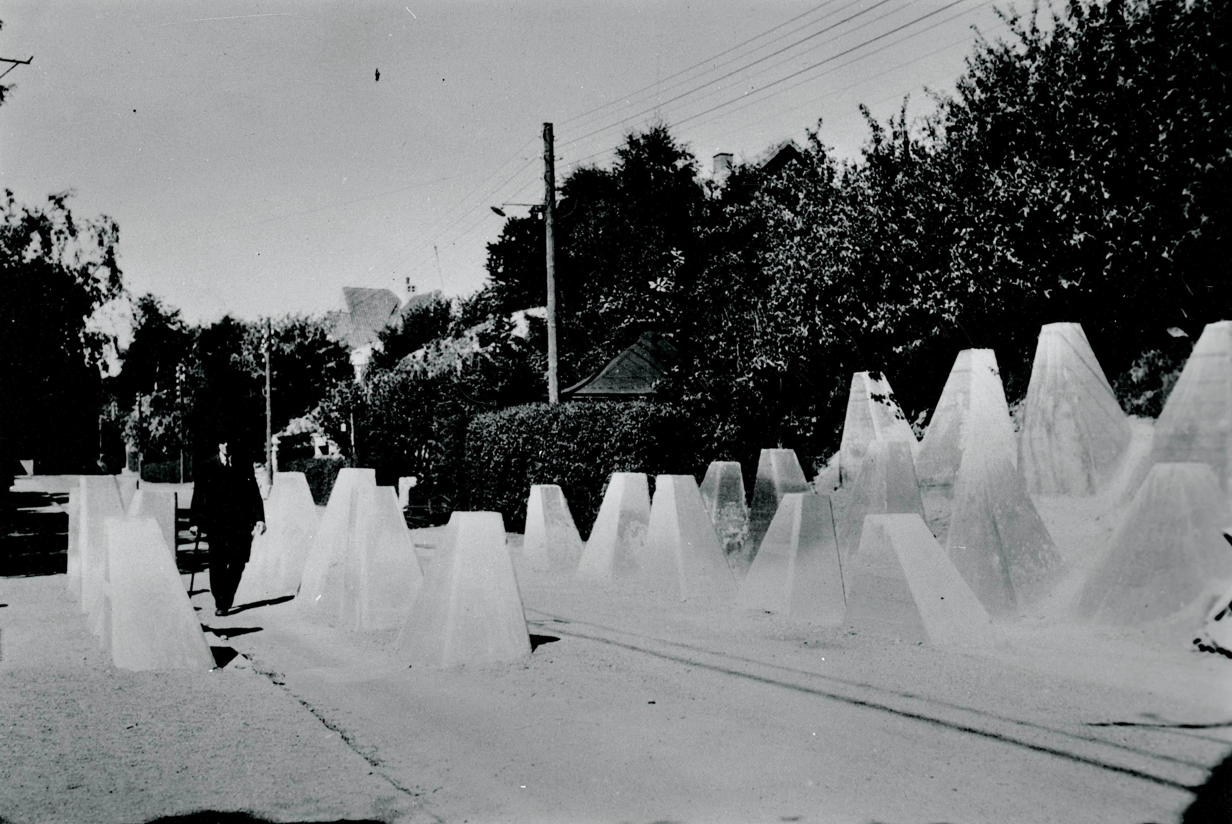 Maskingenkendt tekst fra fotokuvert: Tysk militær og militære anlæg. Kolding Tankspærring på Strandvejen.