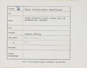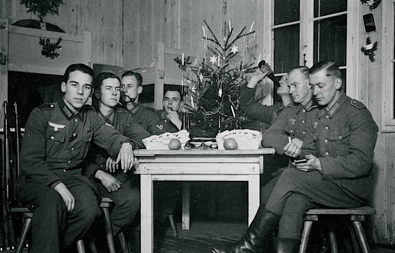 Maskingenkendt tekst fra fotokuvert: Tyske soldater fejrer Julen 1943 på grundskolen, Fåborg.