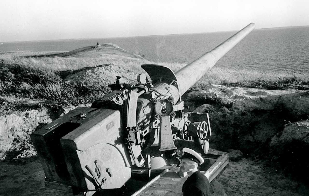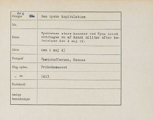 Maskingenkendt tekst fra fotokuvert: Tyskernes store kanoner ved Fyns hoved overtages nu af dansk militær efter befrielsen den 4 maj 45