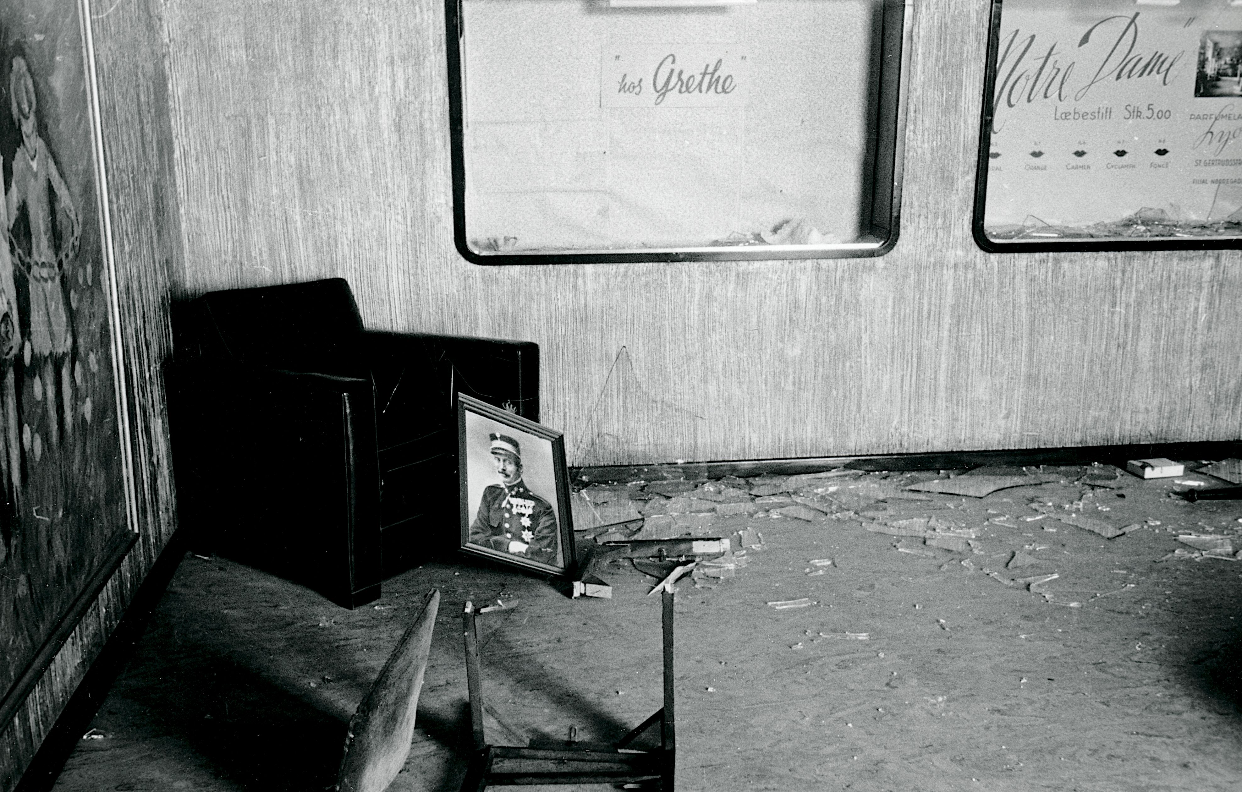 Maskingenkendt tekst fra fotokuvert: Etablissement Ambassadeur, Odense, tyske soldater. Alt blev ødelagt.