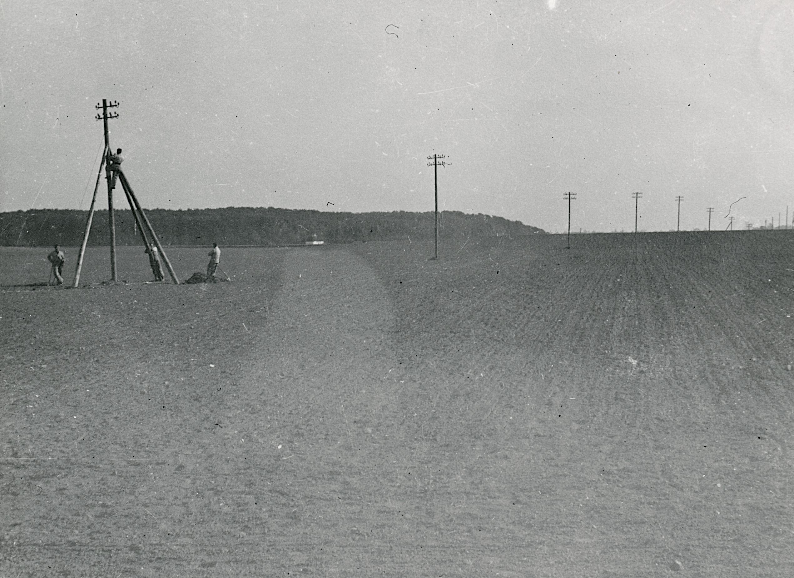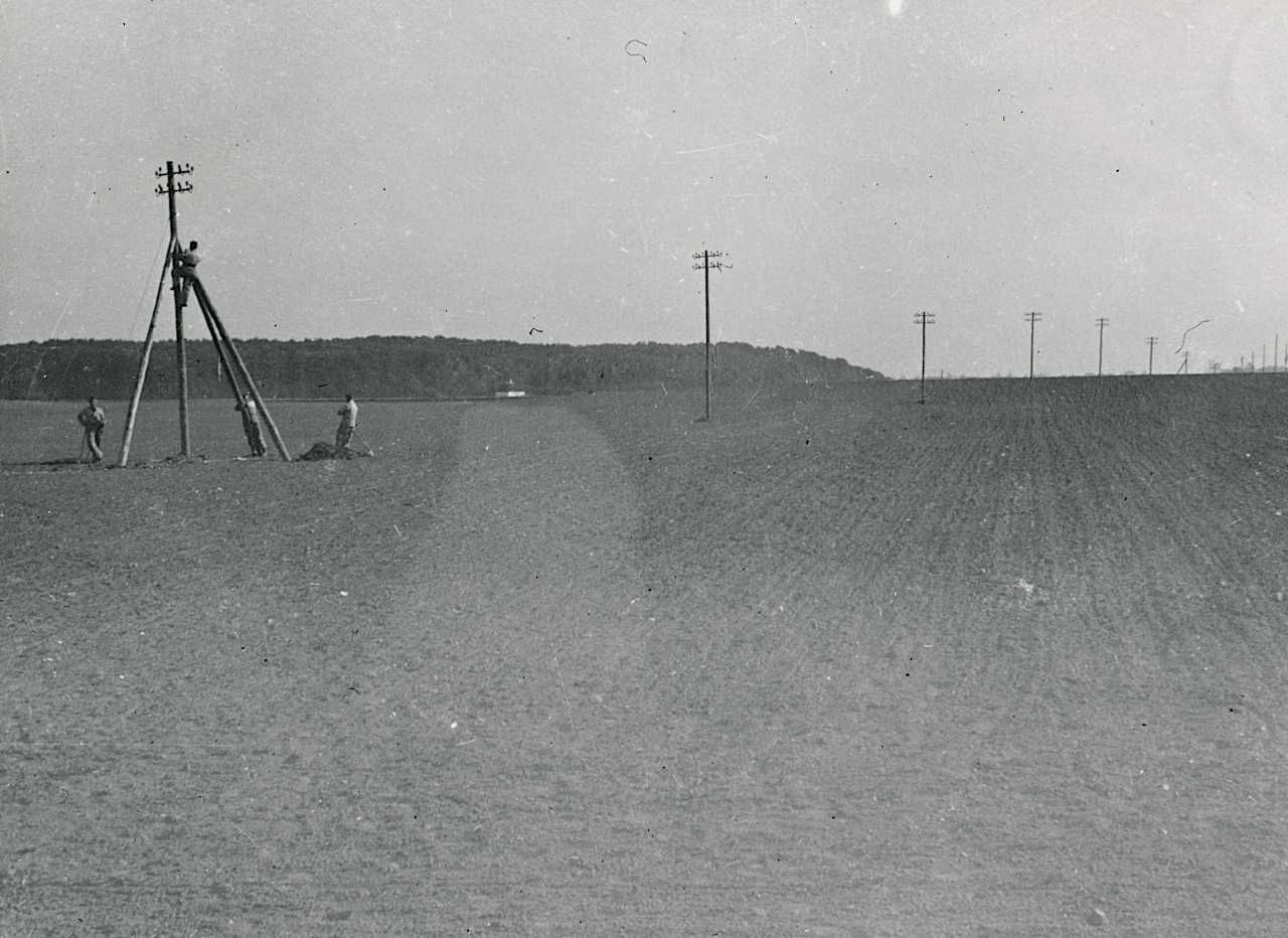 Maskingenkendt tekst fra fotokuvert: I 1943 oprettedes den første store tyske telefoncentral på Lolland-Falster på Hesselø, lidt udenfor Nykøbing. Centralen fik snart egne ledninger over hele amtet med direkte forbindelse til Kbh. og Berlin. Tysk ingeniørarbejde - dansk materiel.