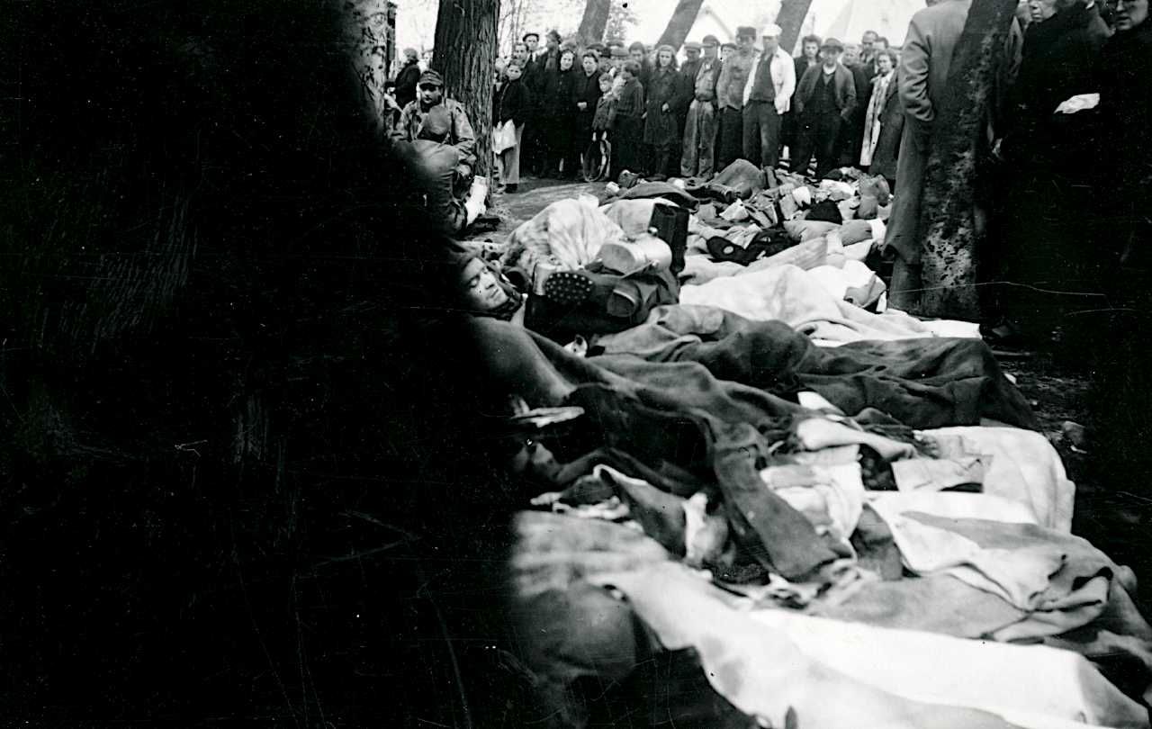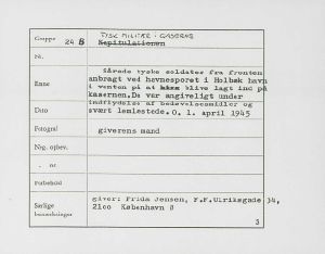 Maskingenkendt tekst fra fotokuvert: Sårede tyske soldater fra fronten anbragt ved havnesporet i Holbæk havn i venten på at blive lagt ind på kasernen. De var angiveligt under indflydelse af bedøvelsesmidler og svært lemlæstede.
