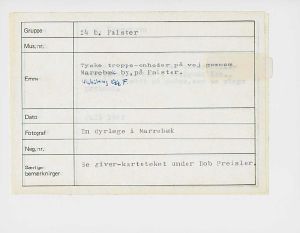 Maskingenkendt tekst fra fotokuvert: Tyske troppe-enheder på vej gennem Marrebæk- by, på Falster.