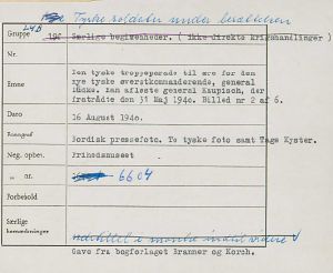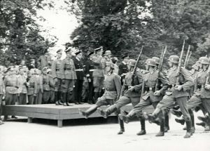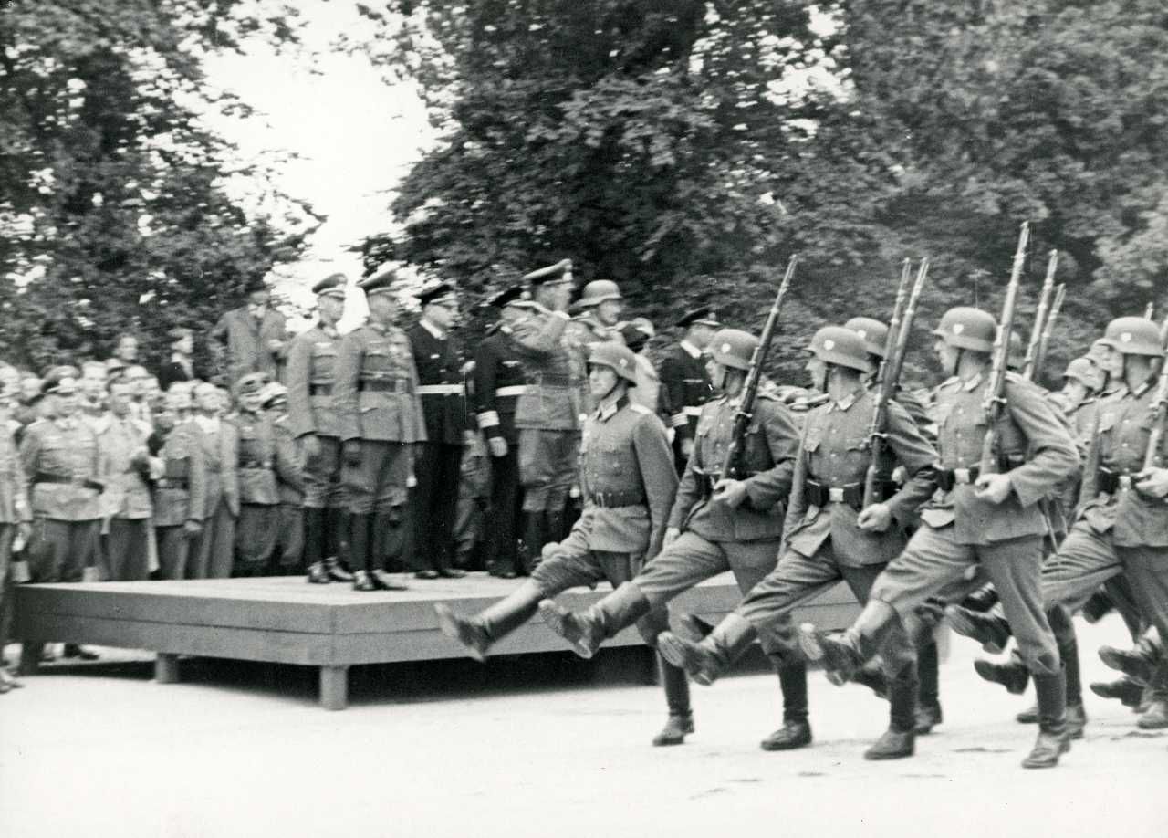 Maskingenkendt tekst fra fotokuvert: Den tyske troppeparade til ære for den nye tyske øverstkommanderende, general Lüdke. Han afløste general Kaupisch, der fratrådte den 31 maj 1940.