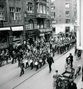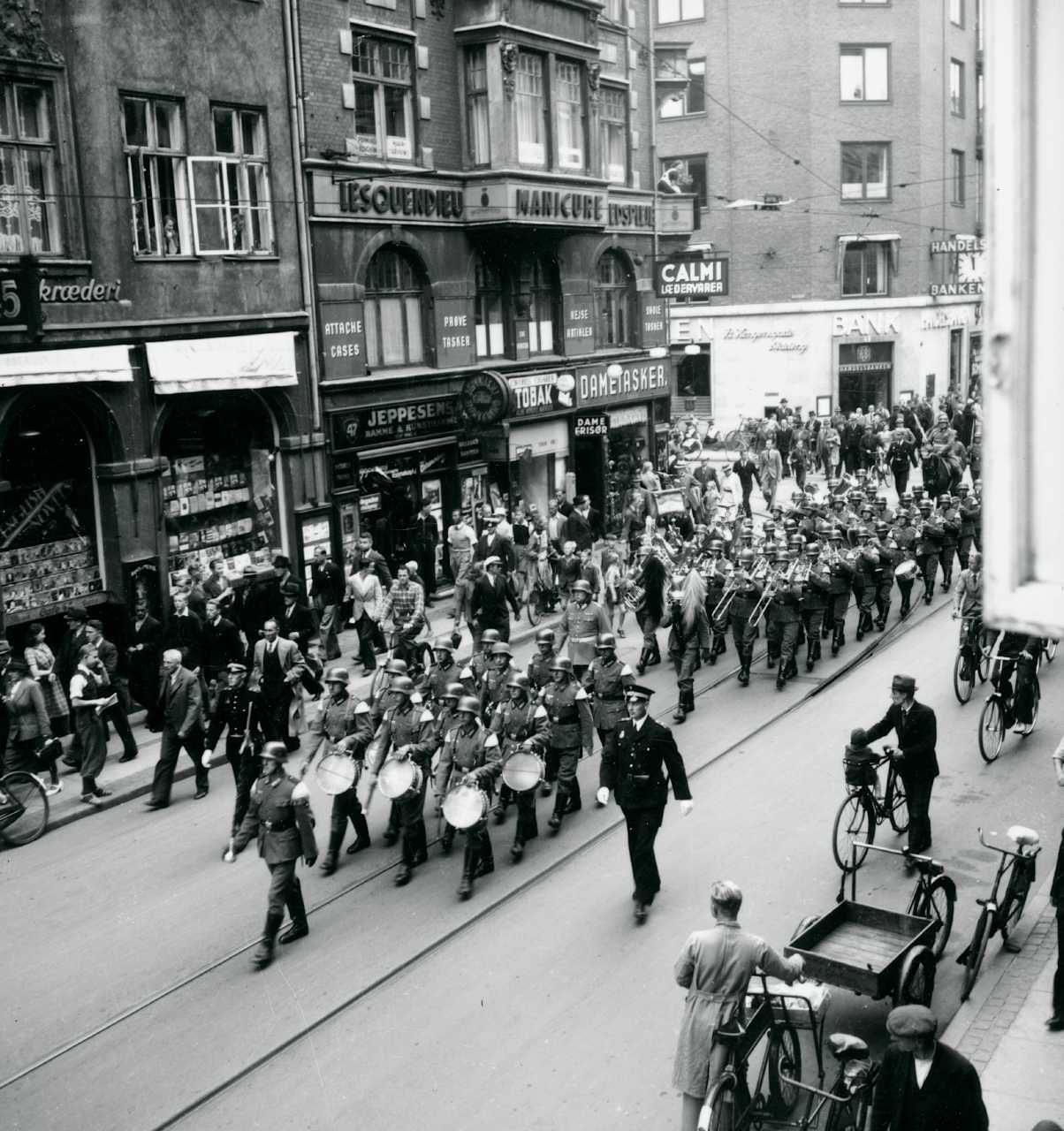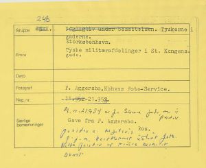 Maskingenkendt tekst fra fotokuvert: Gaderne. Storkøbenhavn. Tyske militærafdelinger i St. Kongens gade.