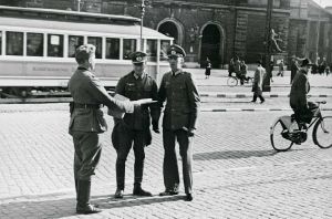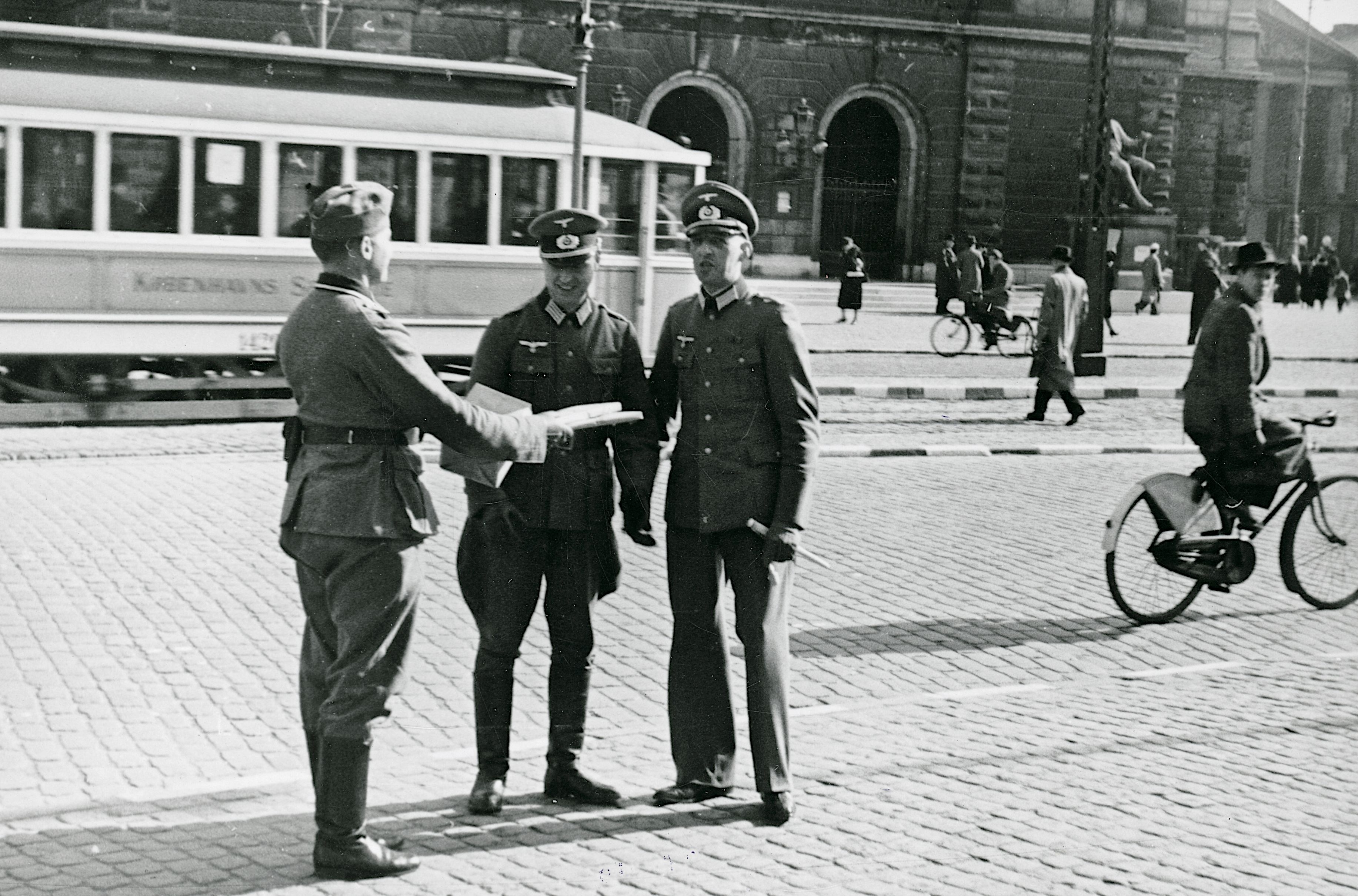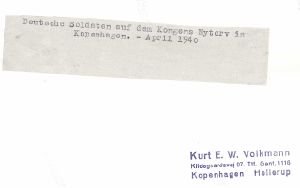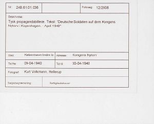 Maskingenkendt tekst fra fotokuvert: Tysk propagandabillede. Tekst "Deutsche Soldaten auf dem Kongens Nytorv i Kopenhagen. - April 1940"