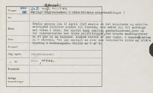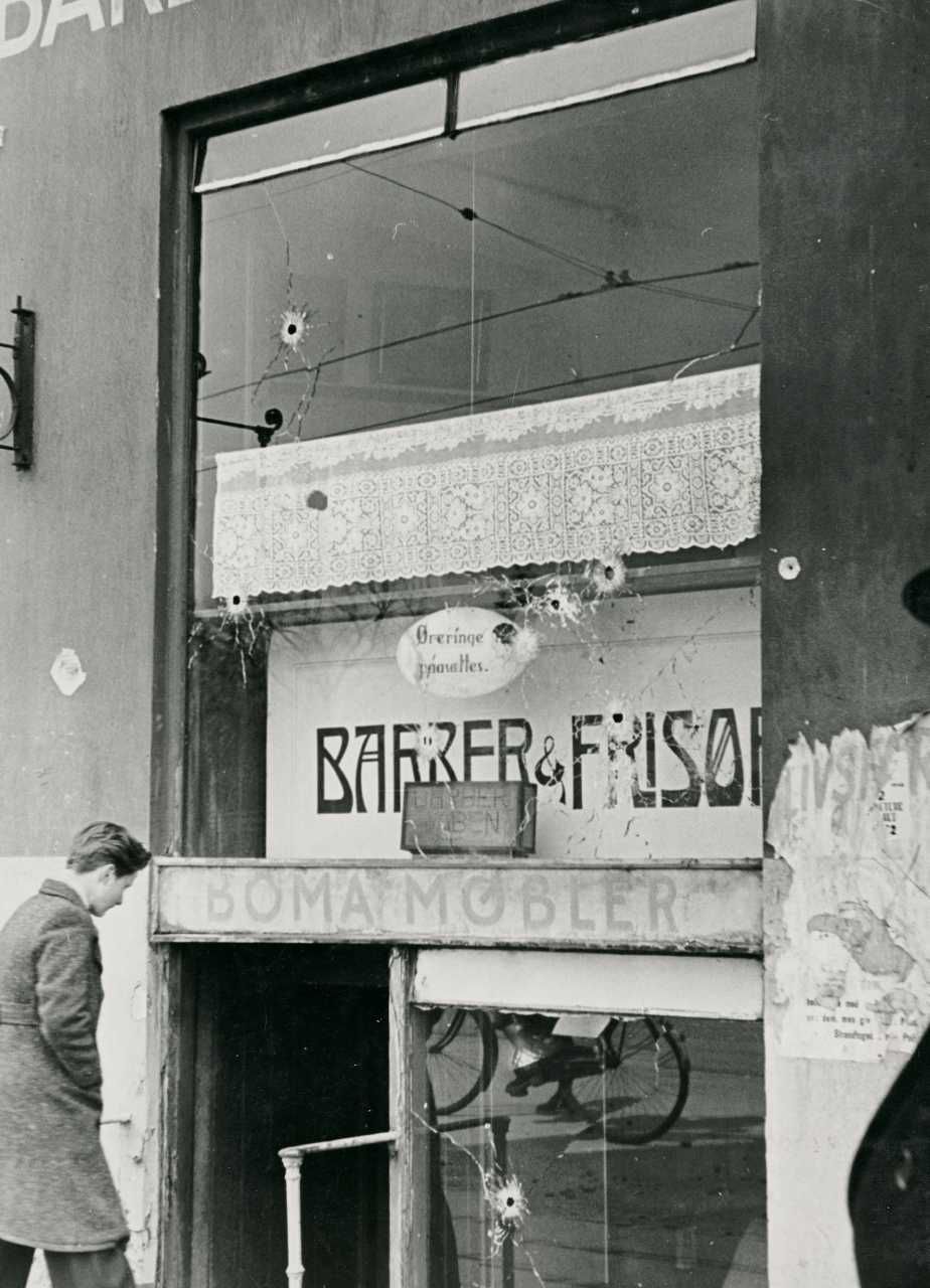 Maskingenkendt tekst fra fotokuvert: Søndag morgen den 22 April 1945 skulle en del ungarnske og enkelte østrigske soldater sendes til fronten, een satte sig til modværge med våben i hånd. Der opstod kamp omkrirg garderkasernen hvor de var indkvarterede med tyske polititropper der brugte maskingeværer og et par 20 mm kanoner, kampen varede et par timer. 8 dansker dræbtes og 7 såredes, det gik særligt ud over den reformerte kirke og KFUMs bygning i Gothersgade.