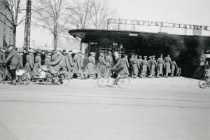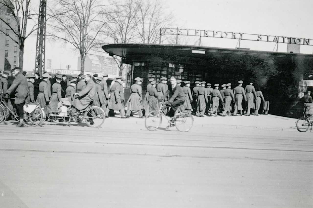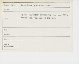 Maskingenkendt tekst fra fotokuvert: Tyske soldater marcherer ind paa "S"-banen paa Vesterport Station.
