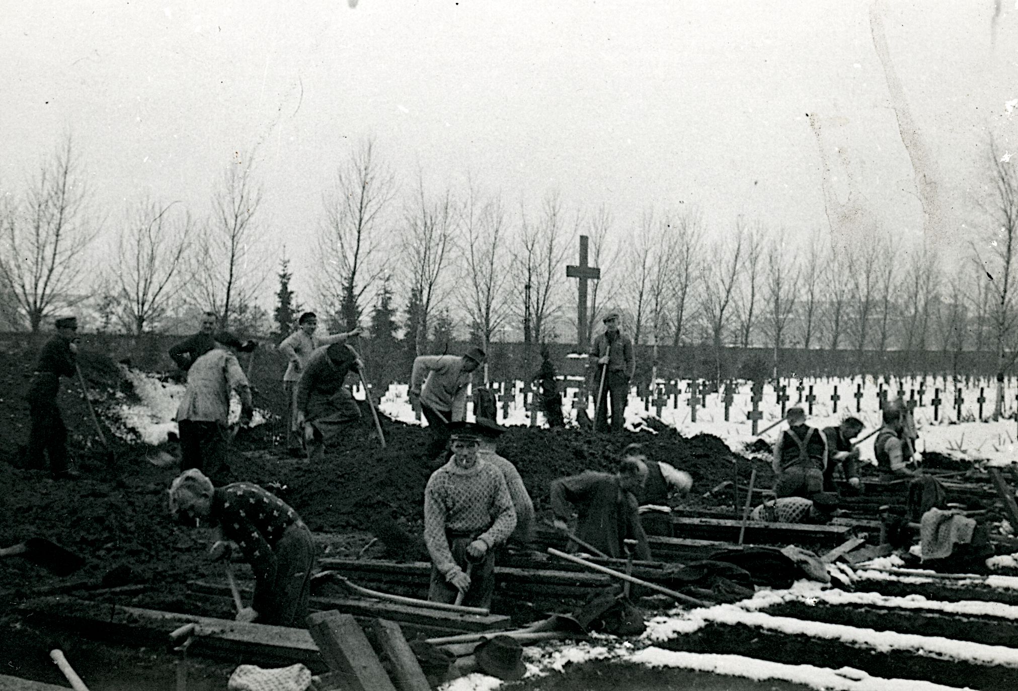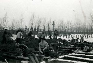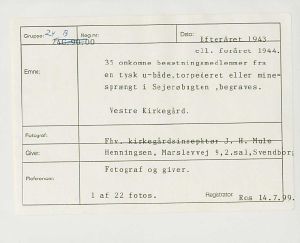 Maskingenkendt tekst fra fotokuvert: 35 omkomne besætningsmedlemmer fra en tysk u-både, torpederet eller minesprængt i Sejerøbugten, begraves. Vestre Kirkegård.