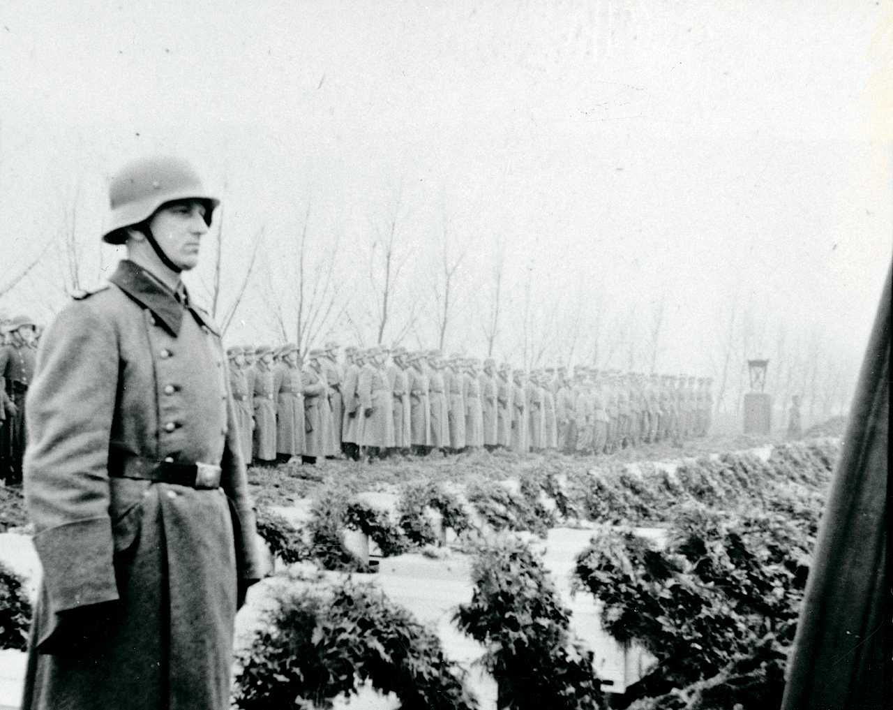 Maskingenkendt tekst fra fotokuvert: Fra begravelsen af ofre for Shellhusbombningen. Mange af kisterne ses. Flot foto. Vestre Kirkegård.