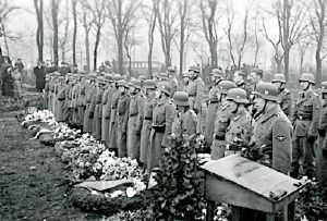 Maskingenkendt tekst fra fotokuvert: Vestre Kirkegård Begravelser af ofre for Shellhusbombningen. Soldater på række. Kranse foran. Bemærk bussen i baggrunden.