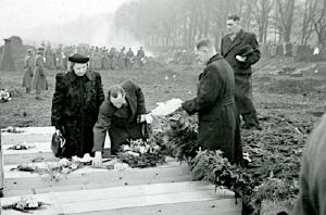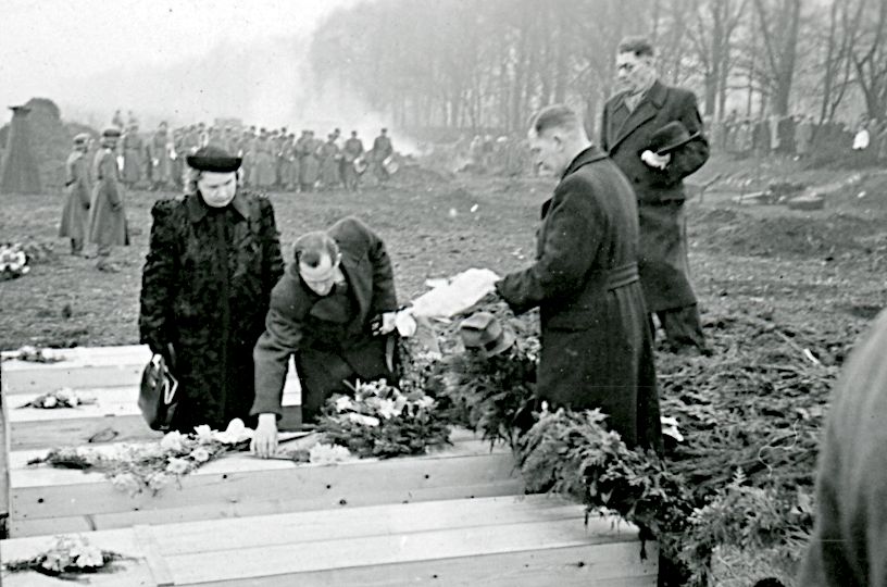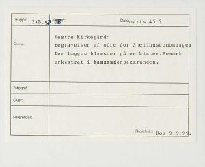 Maskingenkendt tekst fra fotokuvert: Vestre Kirkegård Begravelser af ofre for Shellhusbombningen. Der lægges blomster på en kister. Bemærk orkestret i baggrunden.