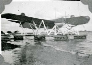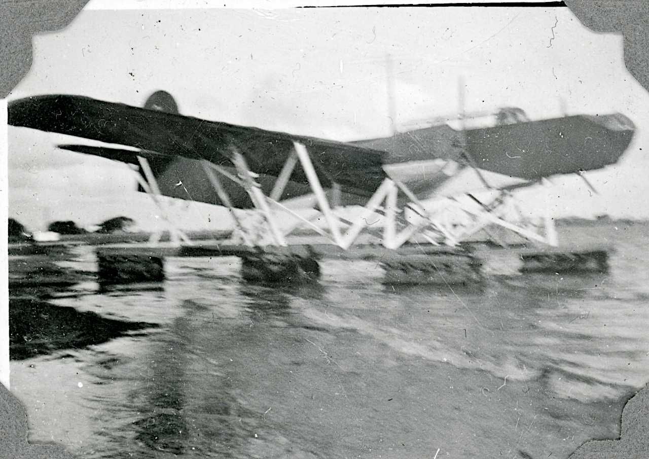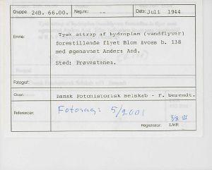 Maskingenkendt tekst fra fotokuvert: Tysk attrap af hydroplan (vandflyver) forestillende flyet Blom & Voss b. 138 med øgenavnet Anders And. Sted Prøvestenen.