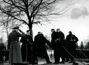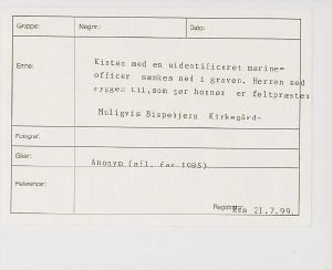 Maskingenkendt tekst fra fotokuvert: Kisten med en uidentificeret marineofficer sænkes ned i graven. Herren med ryggen til, som gør honnør er feltpræsten. Muligvis Bispebjerg Kirkegård