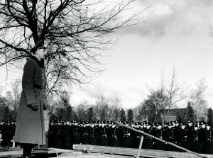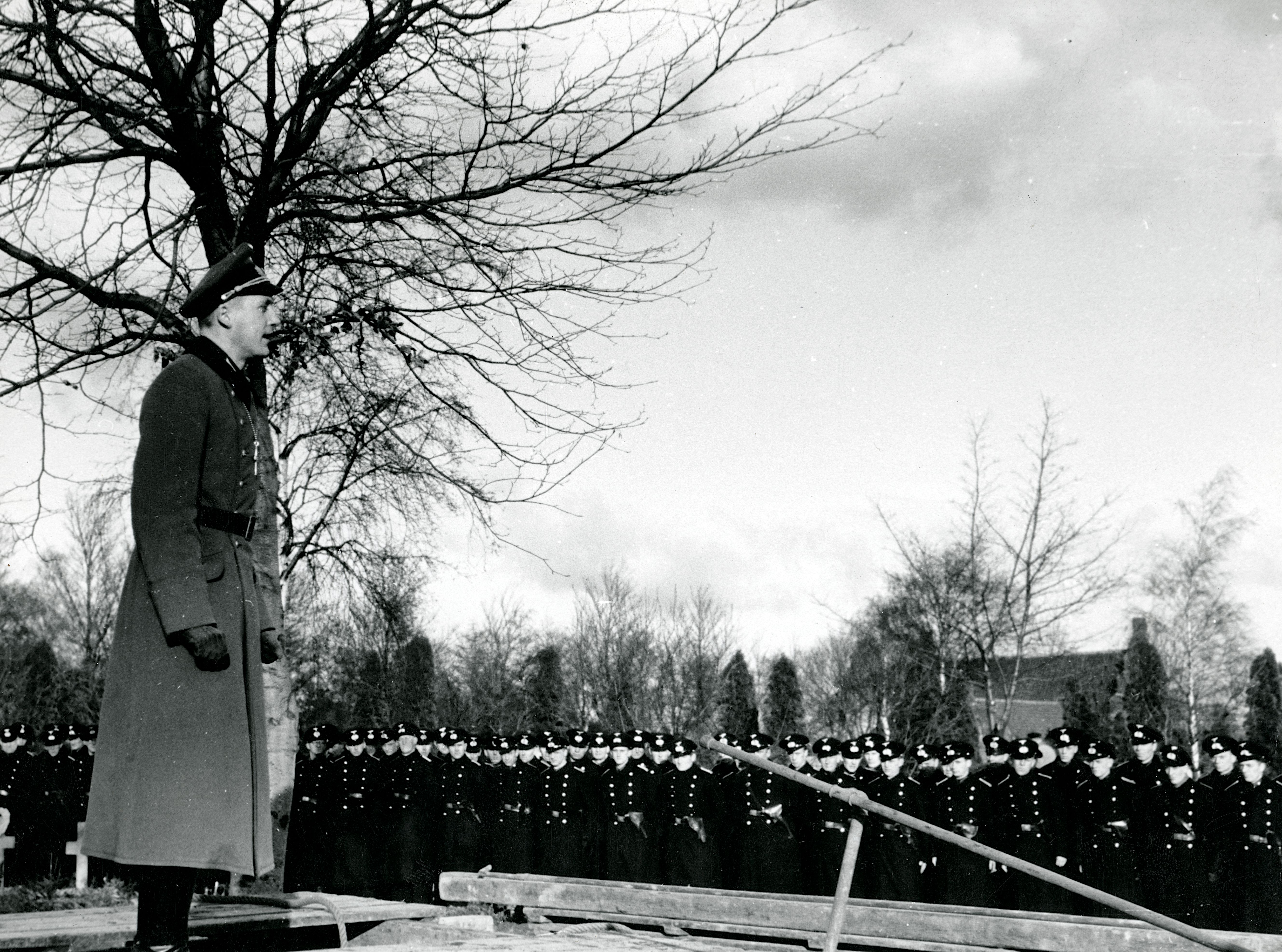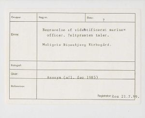 Maskingenkendt tekst fra fotokuvert: Begravelse af uidentificeret marineofficer. Feltpræsten taler. Muligvis Bipsebjerg Kirkegård.