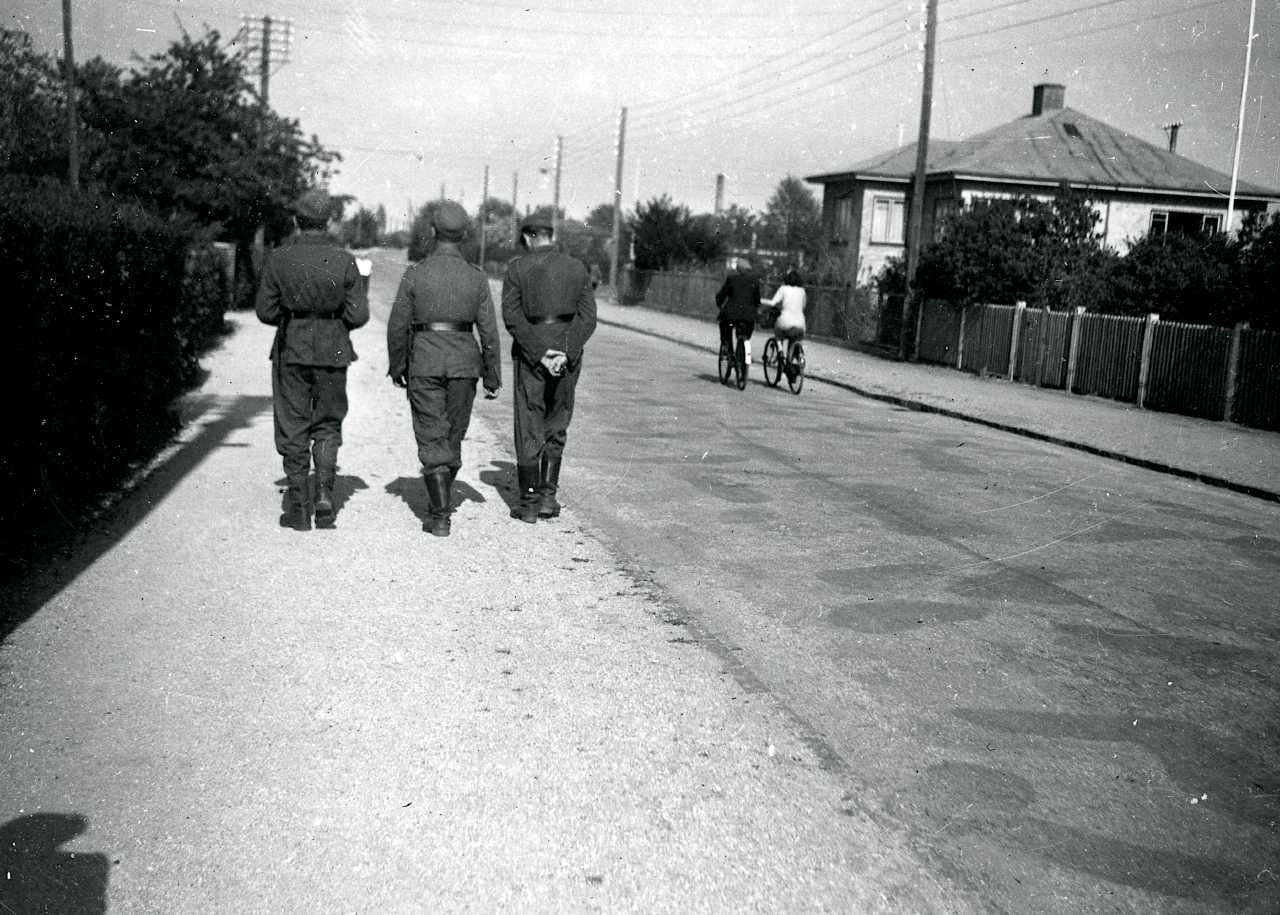 Tre tyske soldater fra Avedørelejren på spadseretur på Brostykkevej i Hvidovre
