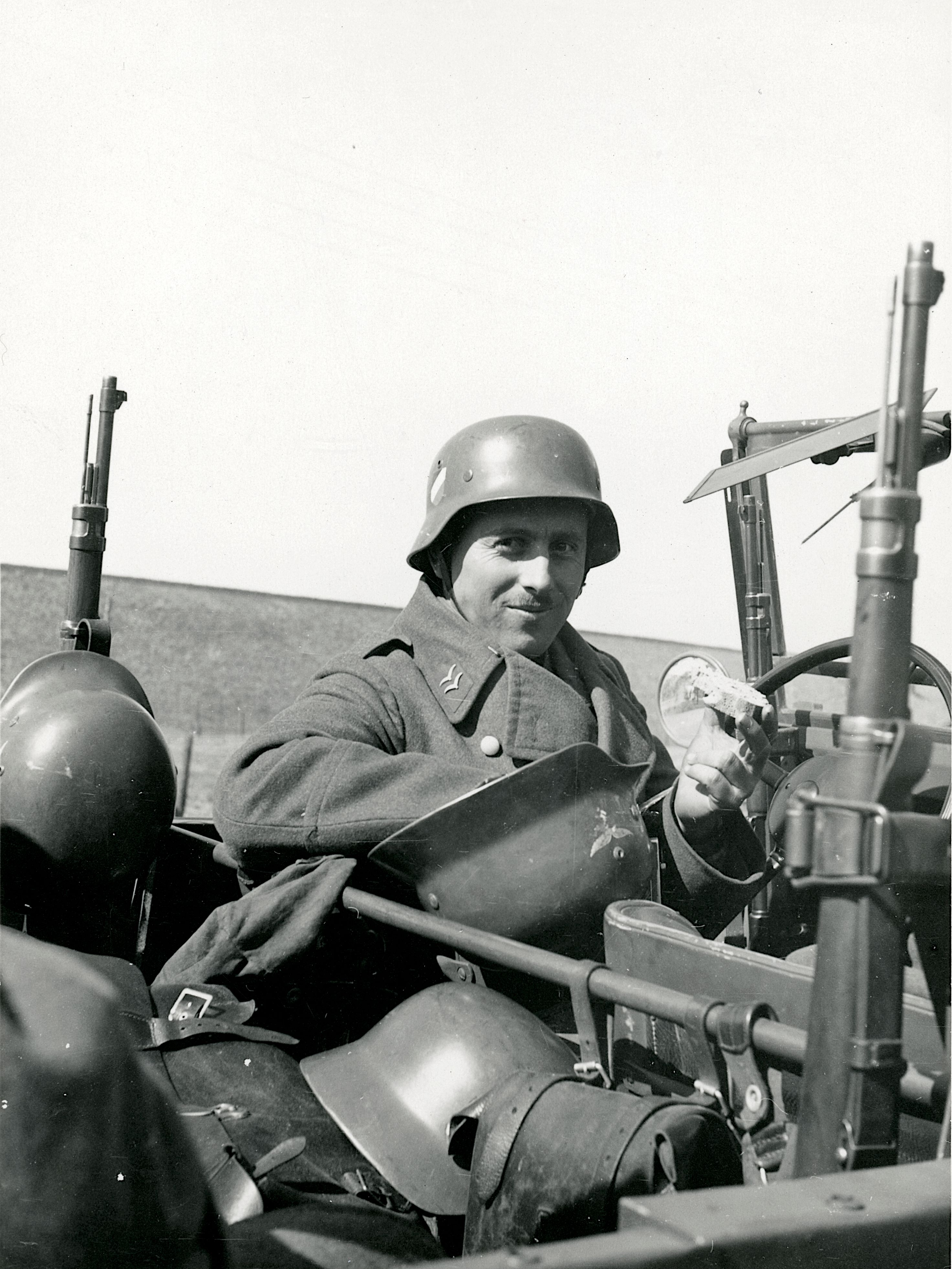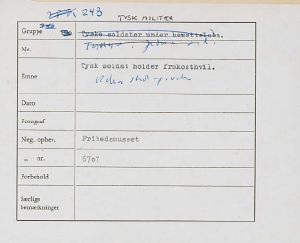 Maskingenkendt tekst fra fotokuvert: Tysk soldat holder frokosthvil.