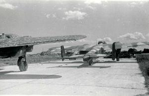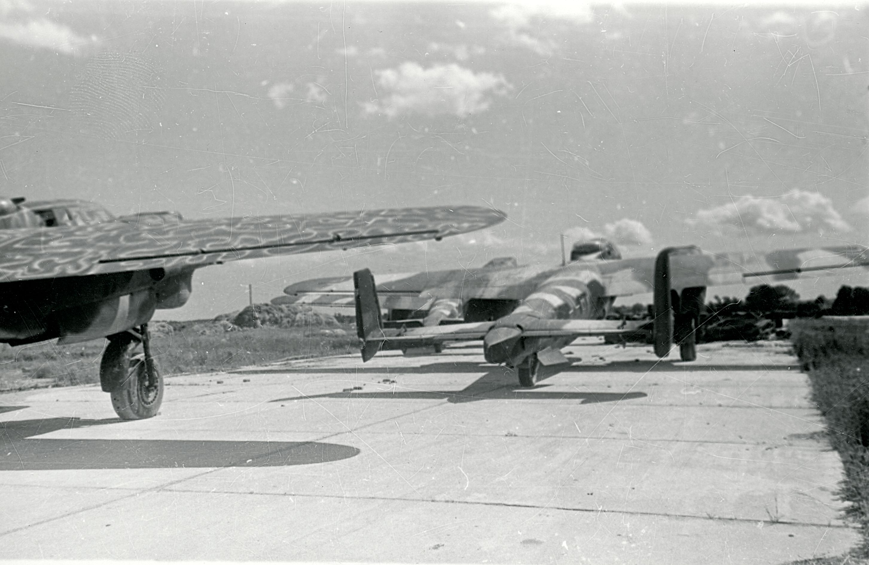Maskingenkendt tekst fra fotokuvert: Tyske flyvemaskiner står alene tilbage efter tyskernes kapitulation d. 4/5 1945