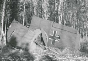 Maskingenkendt tekst fra fotokuvert: Dele af attrap-flyvemaskine i en plantage ved Tirstrup flyveplads.