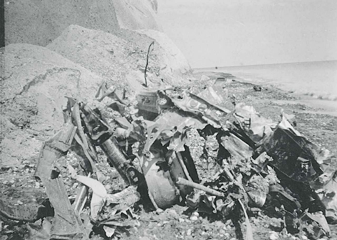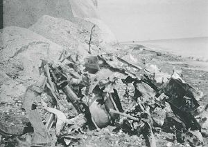 Maskingenkendt tekst fra fotokuvert: Rester af Ju 88 ved Møns Klint efter et mislykket Mistel-forsøg 25.april 44.
