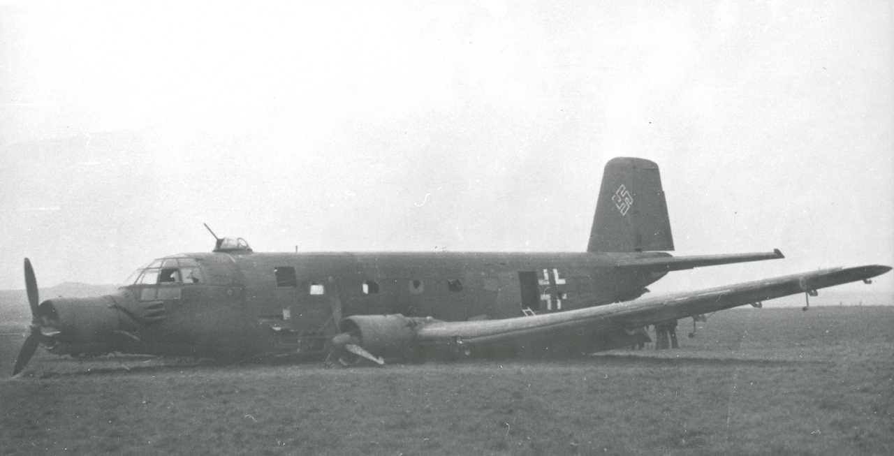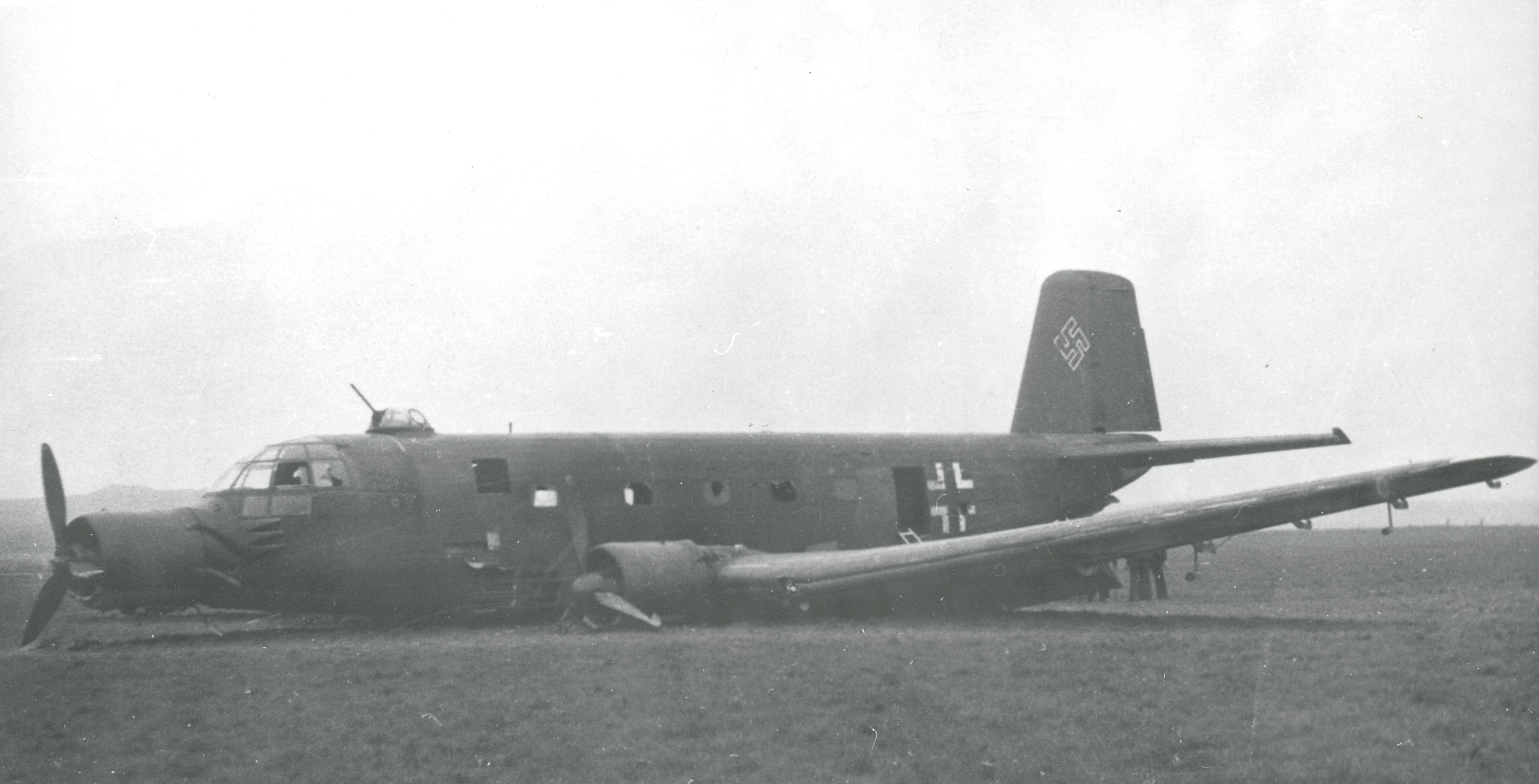 Maskingenkendt tekst fra fotokuvert: Tysk transportmaskine nødlandet ved Rosvang.