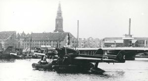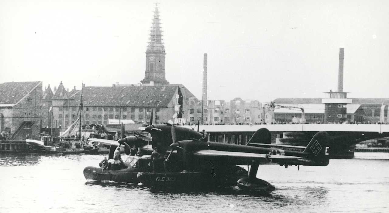 Maskingenkendt tekst fra fotokuvert: Et tysk fly nødlander ved Knippeisbro i København. Ved landingen bliver en fiskekutter stærkt beskadiget og synker kort efter.