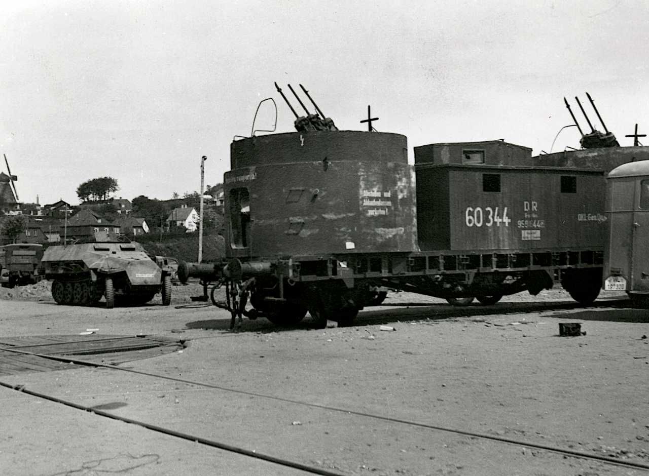 Maskingenkendt tekst fra fotokuvert: Tysk pansertog, som bl.a. har deltaget i kampene i Rusland, fotograferet efter kap. på parkkommandoet i Kolding. Efterladt af tyskerne i skyndingen, hvilket kunne ses af mandskabs rummet mellem de to kanontårne. Her laa alt hulter til bulter. Gulv og bord flød med kort over Rusland