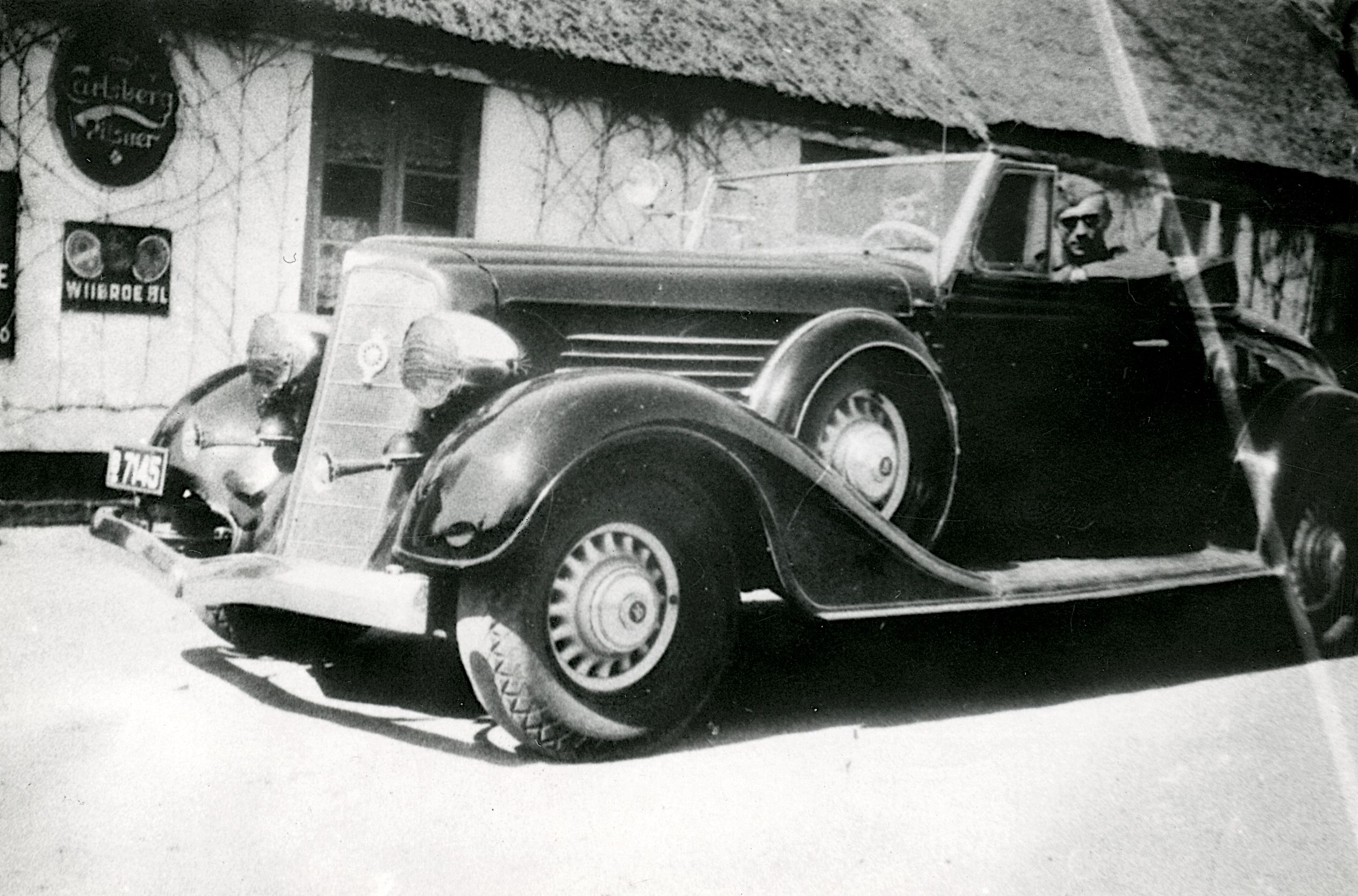 Maskingenkendt tekst fra fotokuvert: Helsingør, April 1940 Restauratør Hansen, Bondegården, Hornbeck, har stillet sin bil til raadighed for værnemagten. Han blev senere storværnemager.