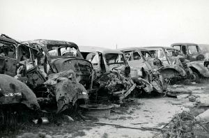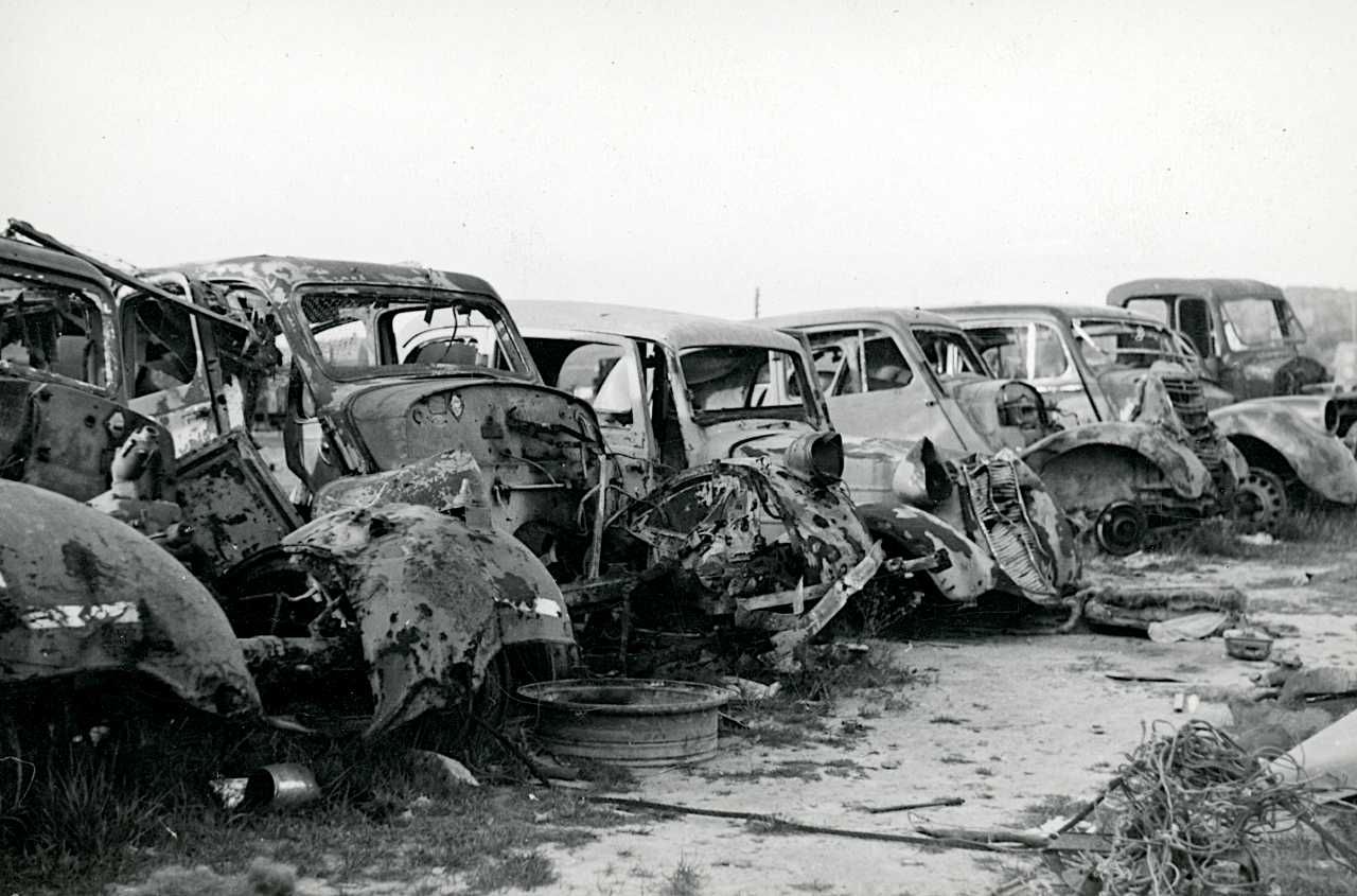 Maskingenkendt tekst fra fotokuvert: Ødelagte biler, sandsynligvis tyske og sandsynligvis i Danmark.